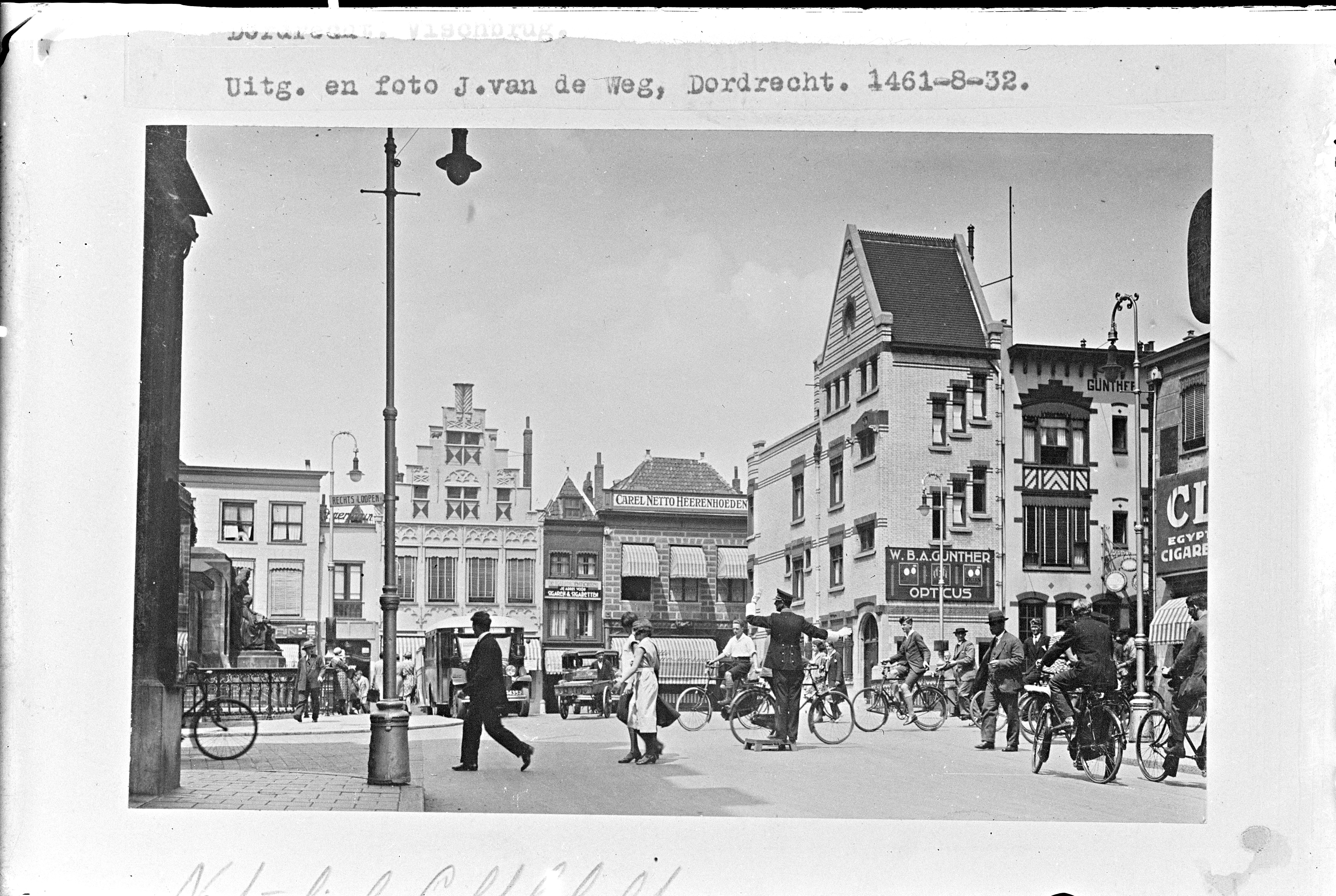 - beeldhouwwerken / standbeelden bruggen fietsers hoedenwinkels lantaarns / straatverlichting opticiens politie trapgevels voetgangers
