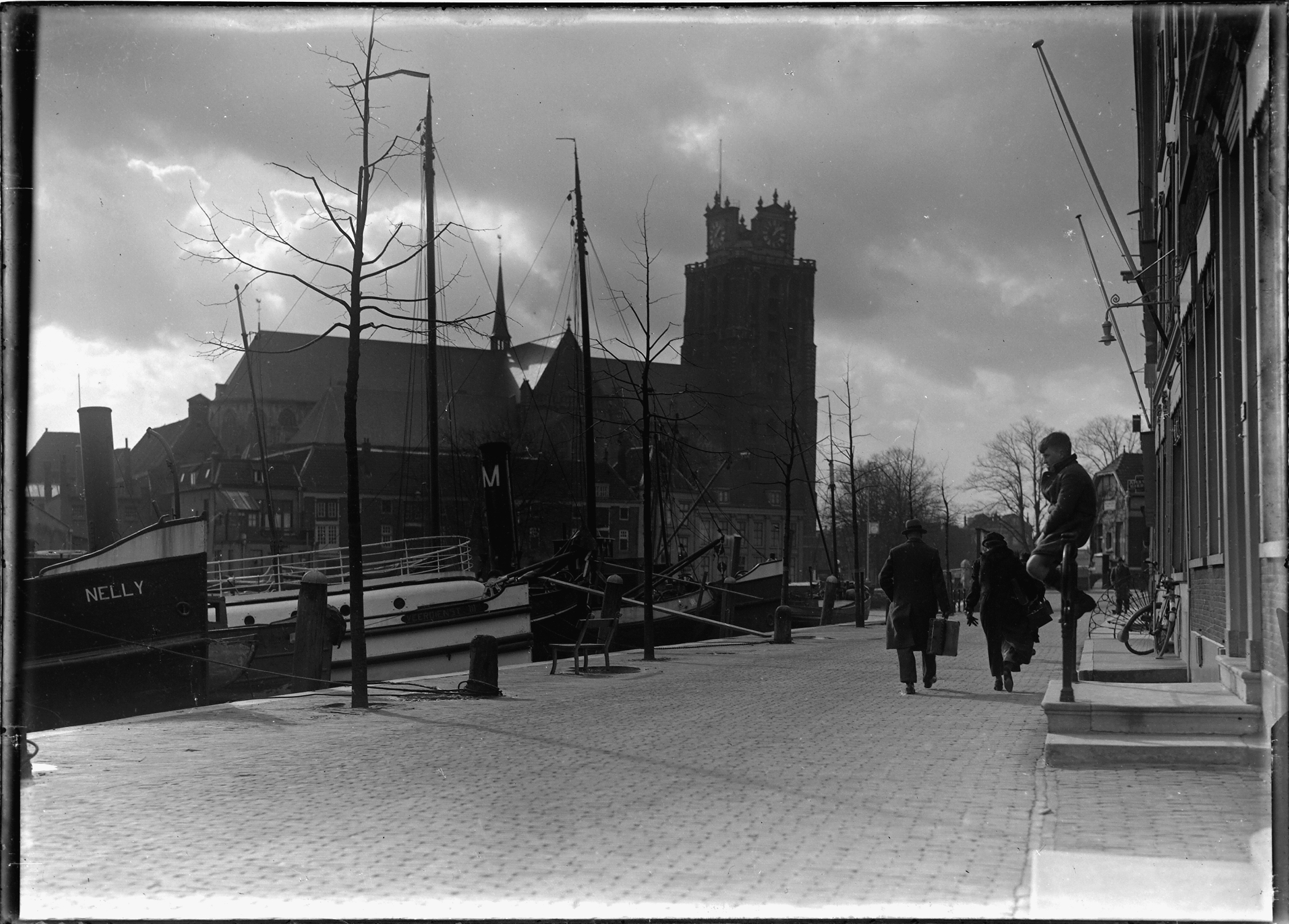 De Grote Kerk gezien vanaf de Nieuwe Haven. Het gebouw achter de scheepsschoorsteen met …
