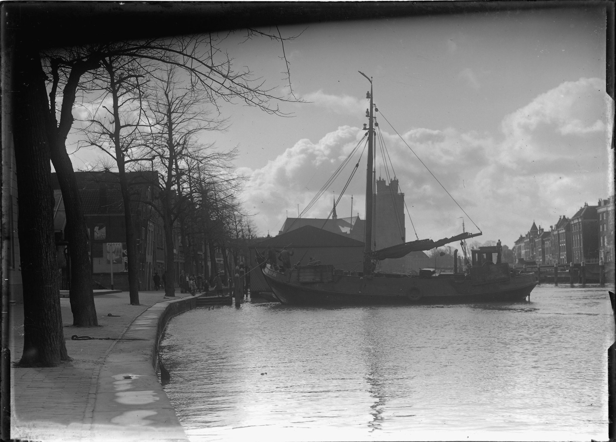 De Nieuwe Haven vanaf de Knolhaven maar het zuidwesten gezien. Achter het zeilschip ligt het botenhuis van de roei- en zeilvereniging ter hoogte van de Vismarkt.