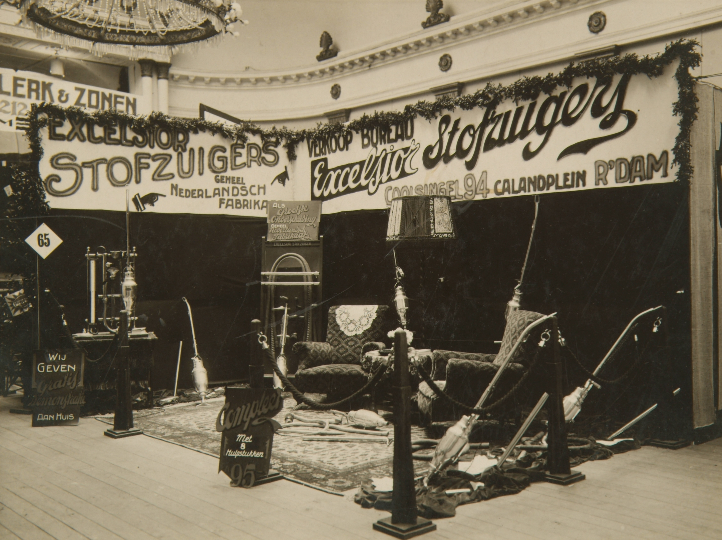 Stand van door de Meterfabriek vervaardigde Excelsior stofzuigers op een tentoonstelling te Rotterdam.