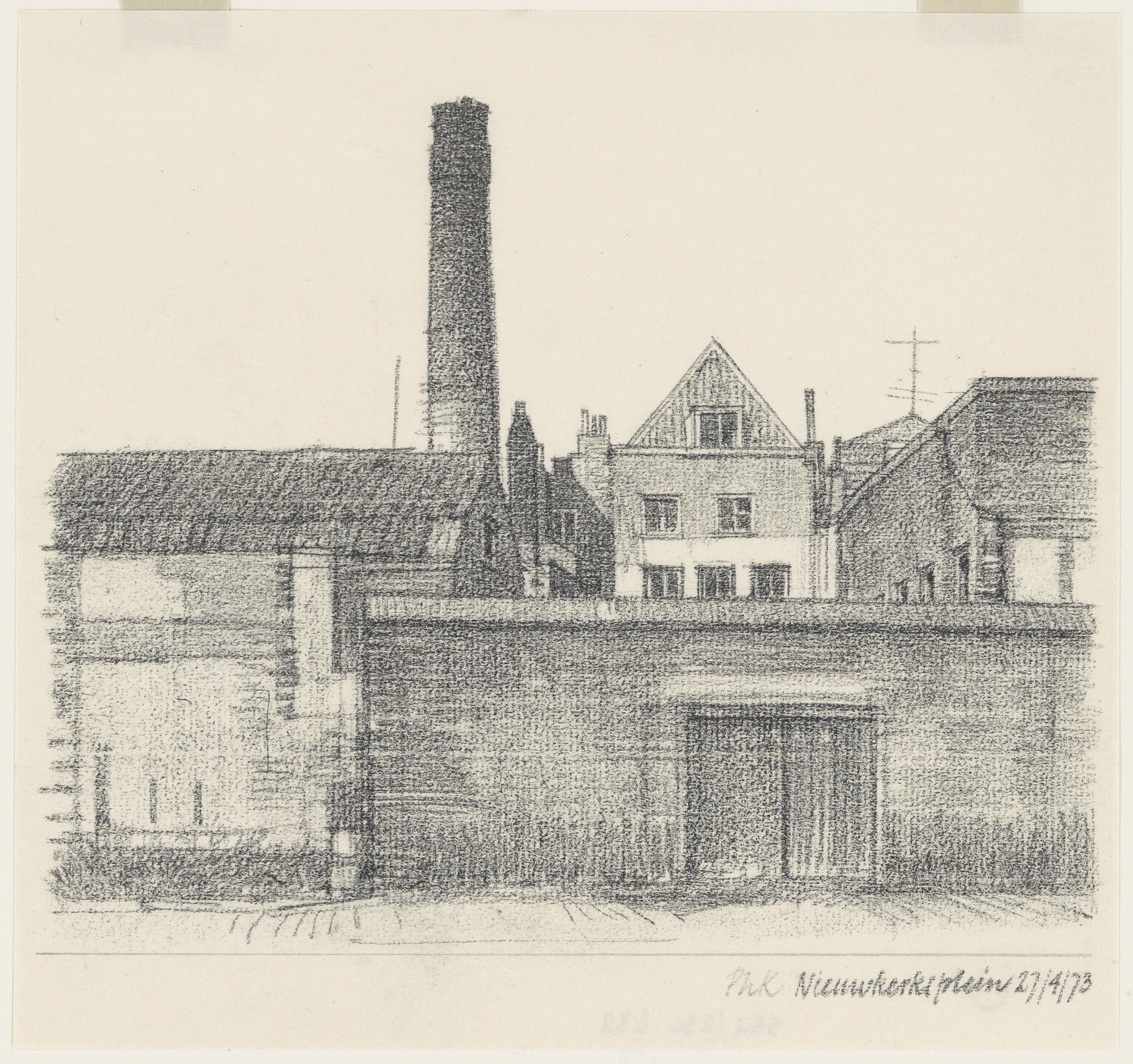 - Tekening door Philip Kouwen van de Wijngaardstraat richting Voorstraat. De schoorsteen staat bij bakkerij De Berenkamp in de Nieuwkerkstraat.