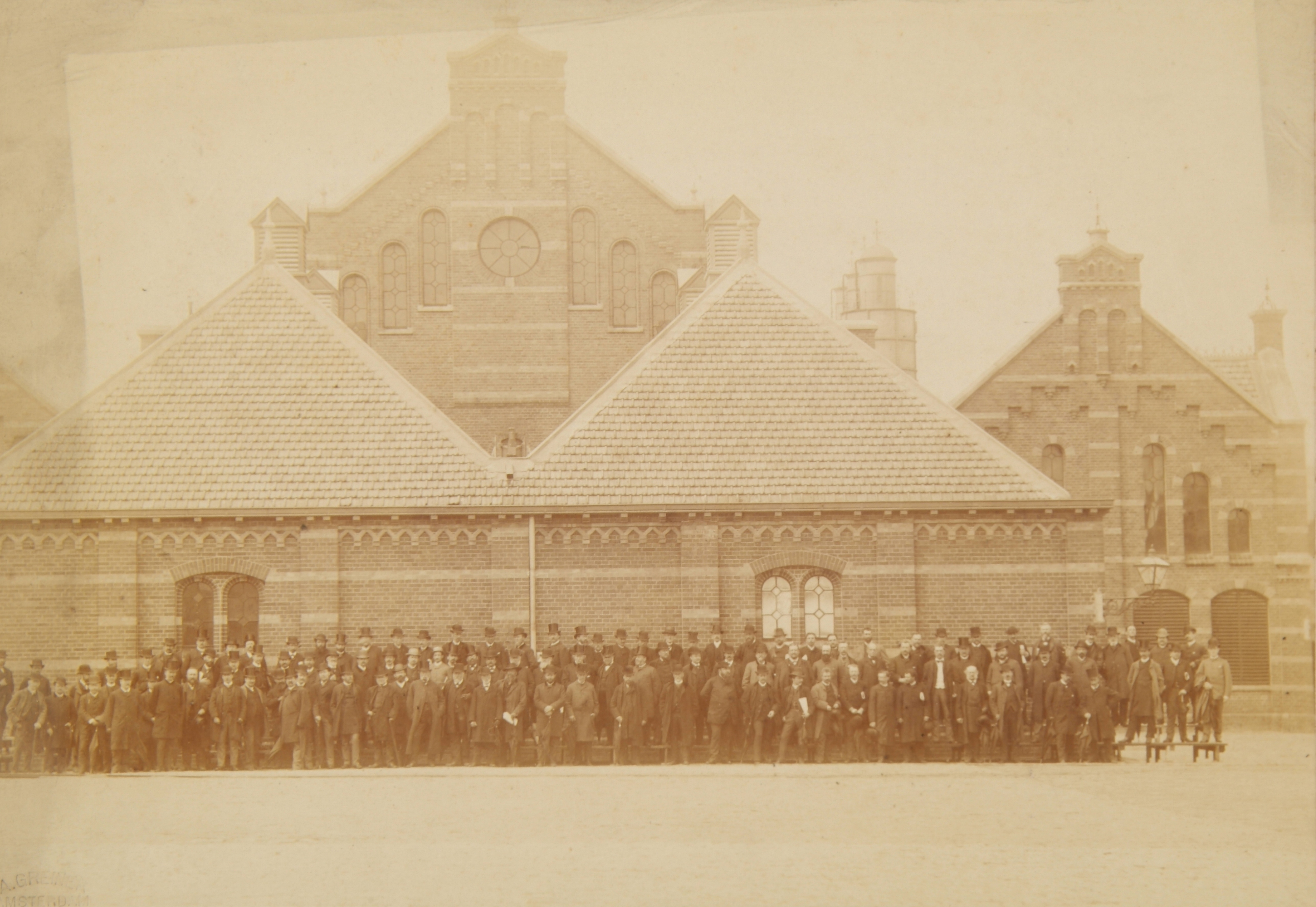 - Groepsportret van een gezelschap heren die iets te maken hebben met de Meterfabriek.
