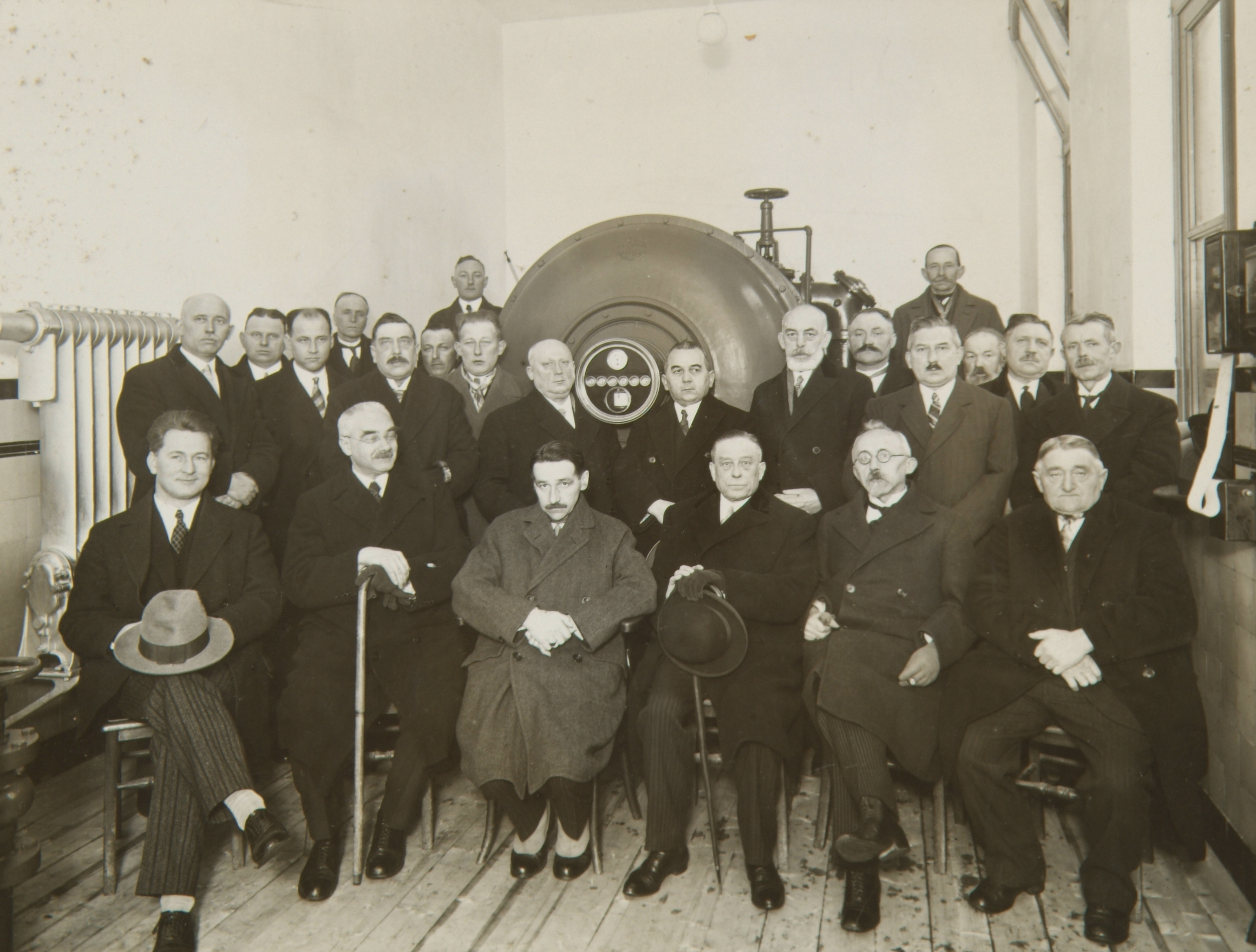 Groepsportret van een gezelschap heren die iets te maken hebben met de Meterfabriek.