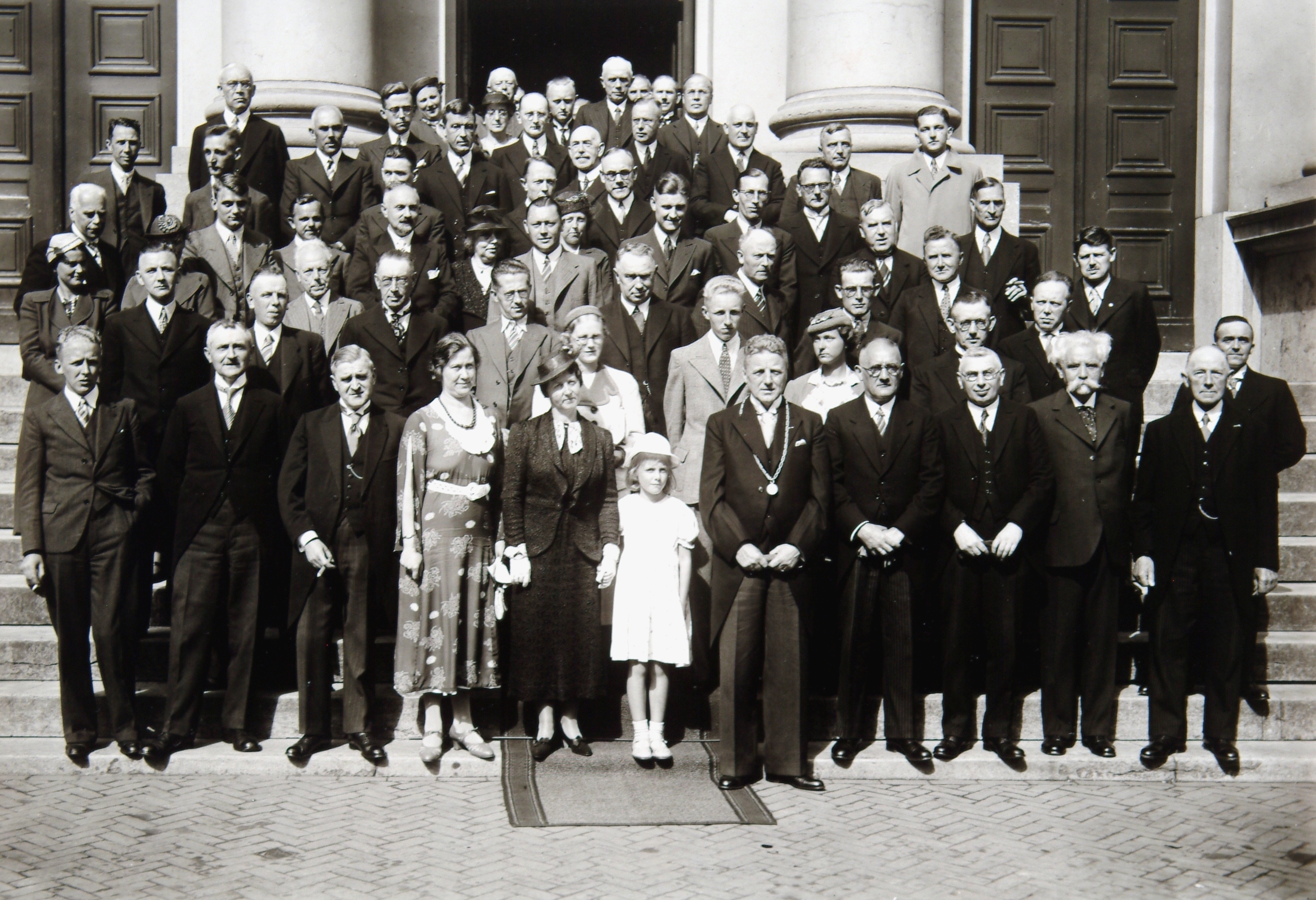 Familie en raadsleden bij de installatie van burgemeester Bleeker op de trappen van het stadhuis. Op de voorste rij o.m. secretaris Poll, wethouders Sander en Smit-Pieters, het burgemeesterspaar, wethouders Dicke, Van Huiden en de heren Reinhardt en Van Schelt.