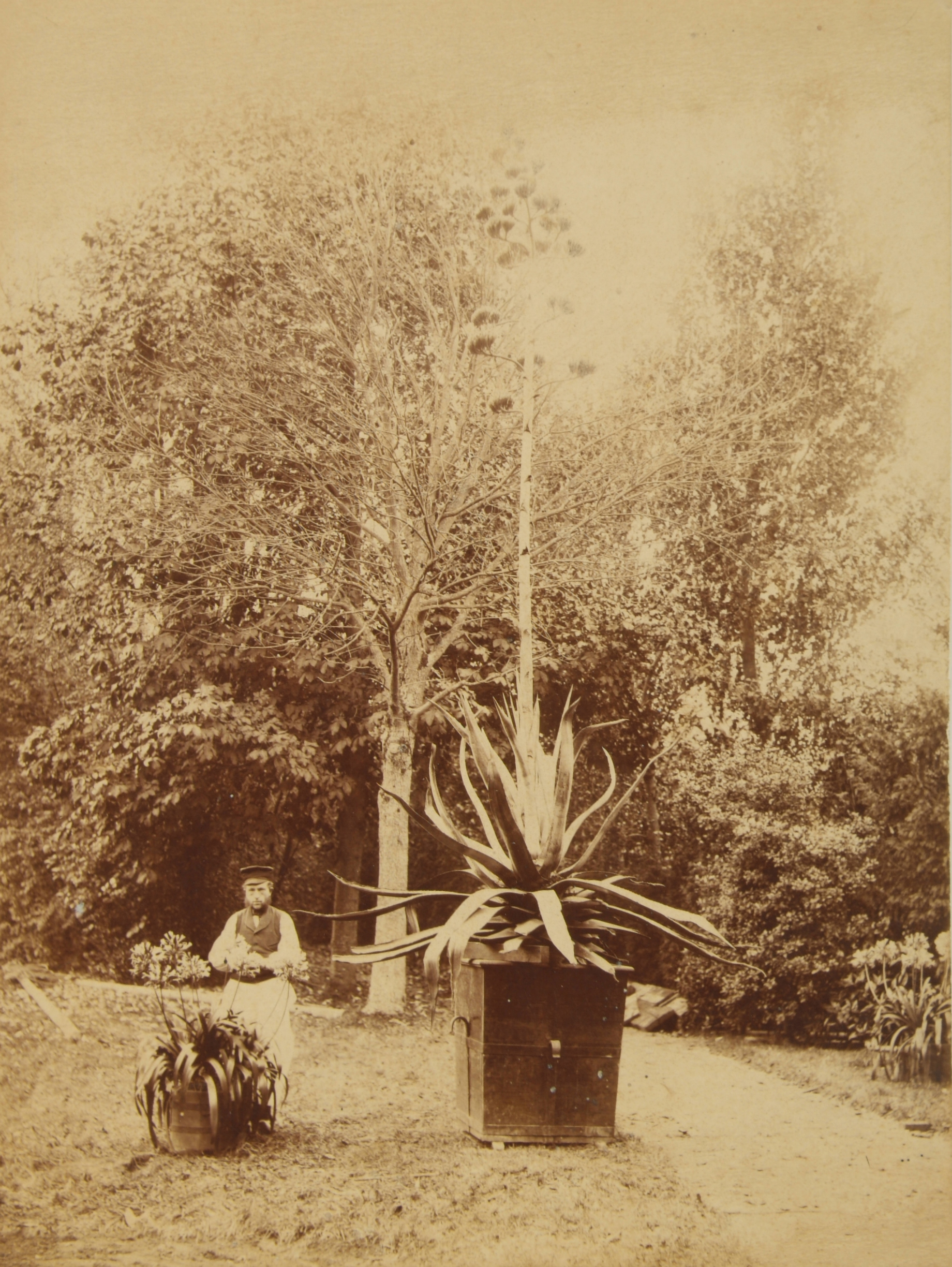 Tuinman bij een bloeiende agave in tuin met van landgoed Dordwijk.