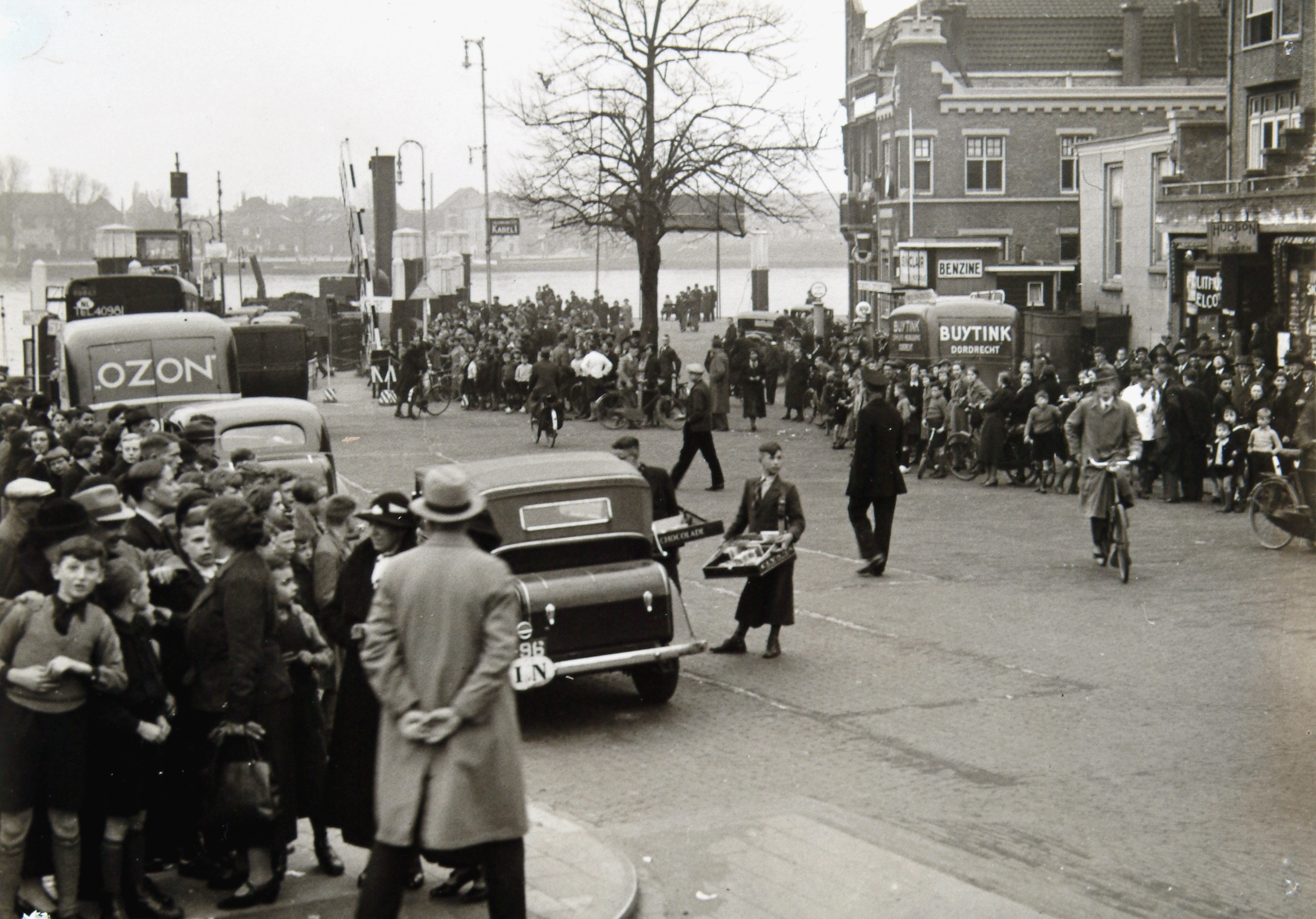 Veel mensen wachten bij het Zwijndrechts veer op de terugkomst van prinses Juliana en prins Bernhard van hun huwelijksreis. Twee jongens lopen rond om versnaperingen te verkopen.