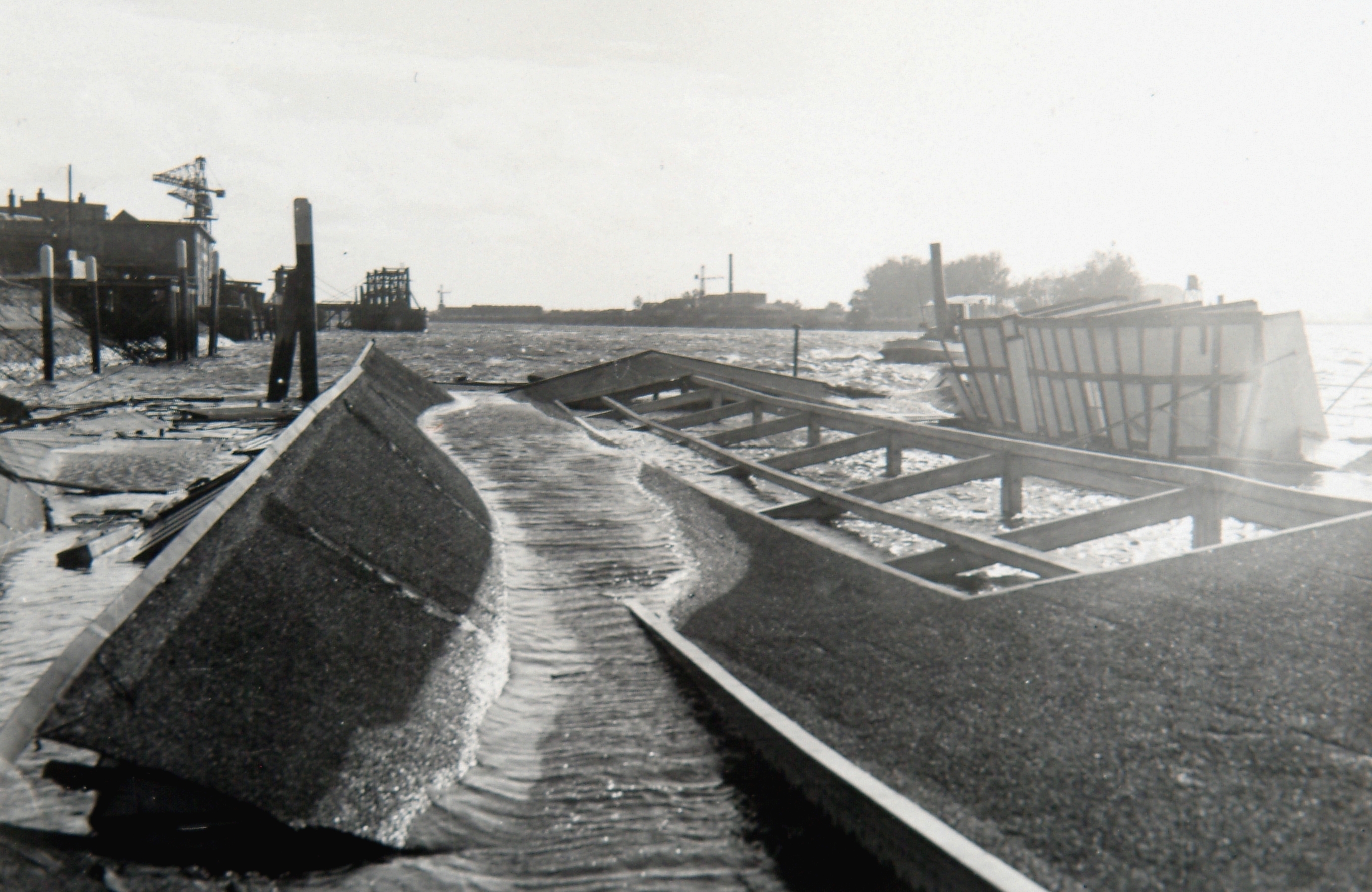 - Verwoeste zweminrichting aan de 's-Gravendeelsedijk door een krachtige storm. Aan de overkant van de Dordtsche Kil is 's-Gravendeel te zien.