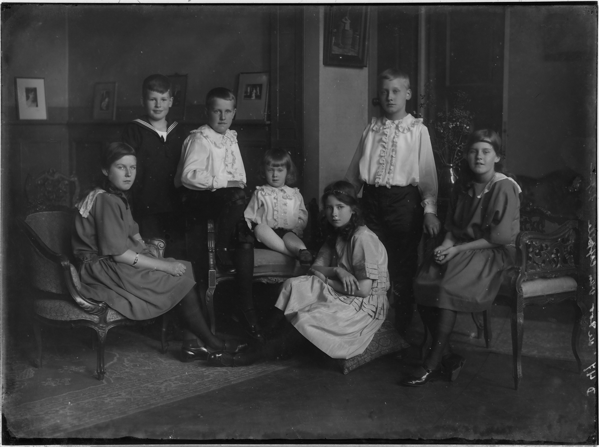 - groepsportret van 7 kinderen uit de familie De Roo van Westmaas waarschijnlijk in villa Weizigt