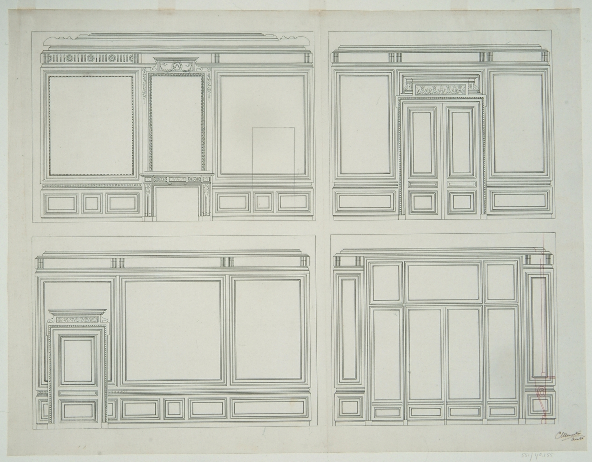 Bouwkundige tekeningen betreffende de gedeeltelijke verbouwing van het huis Nieuwe Haven 39 in 1886 door de architect C. Muysken; betimmering der tuinkamer in Lodewijk XVI-stijl.
