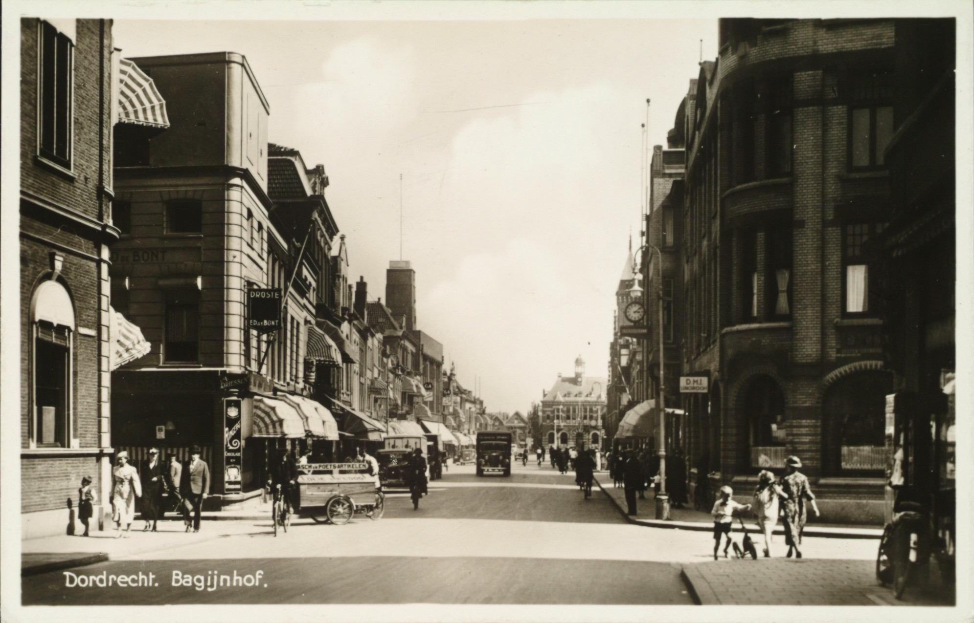 - Het Bagijnhof vanaf de Visstraat bij de hoek van de Korte Breestraat (links) en de Lange Breestraat. Links het torentje van C&A, op de achtergrond de Nutsspaarbank en rechts op de voorgrond de lunchroom van de DMI. Links op de hoek de winkel van Driessen.