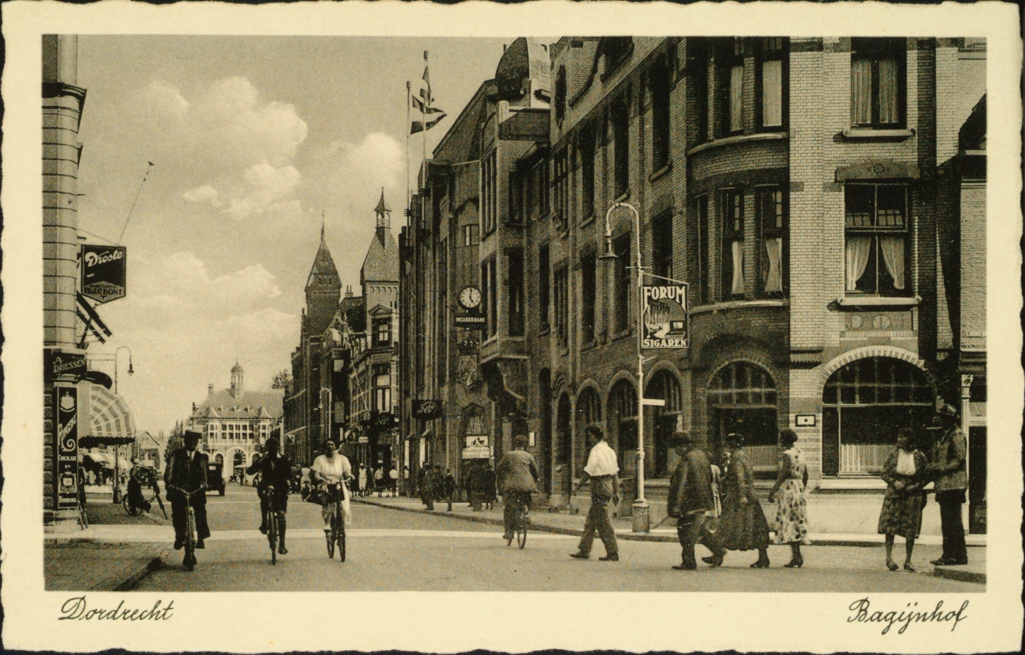 - Het Bagijnhof vanaf de hoek van de Lange Breestraat (rechts) naar de Nutsspaarbank.