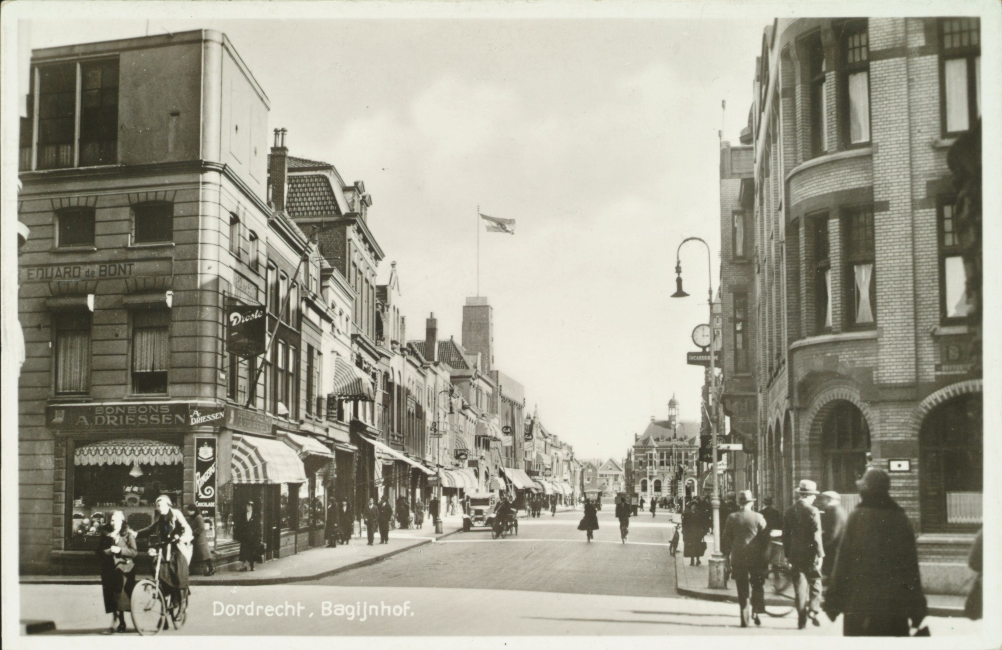 - Het Bagijnhof vanaf de Visstraat bij de hoek van de Korte Breestraat (links) en de Lange Breestraat. Links het torentje van C&A, op de achtergrond de Nutsspaarbank en rechts op de voorgrond de lunchroom van de DMI. Links op de hoek de winkel van Driessen.