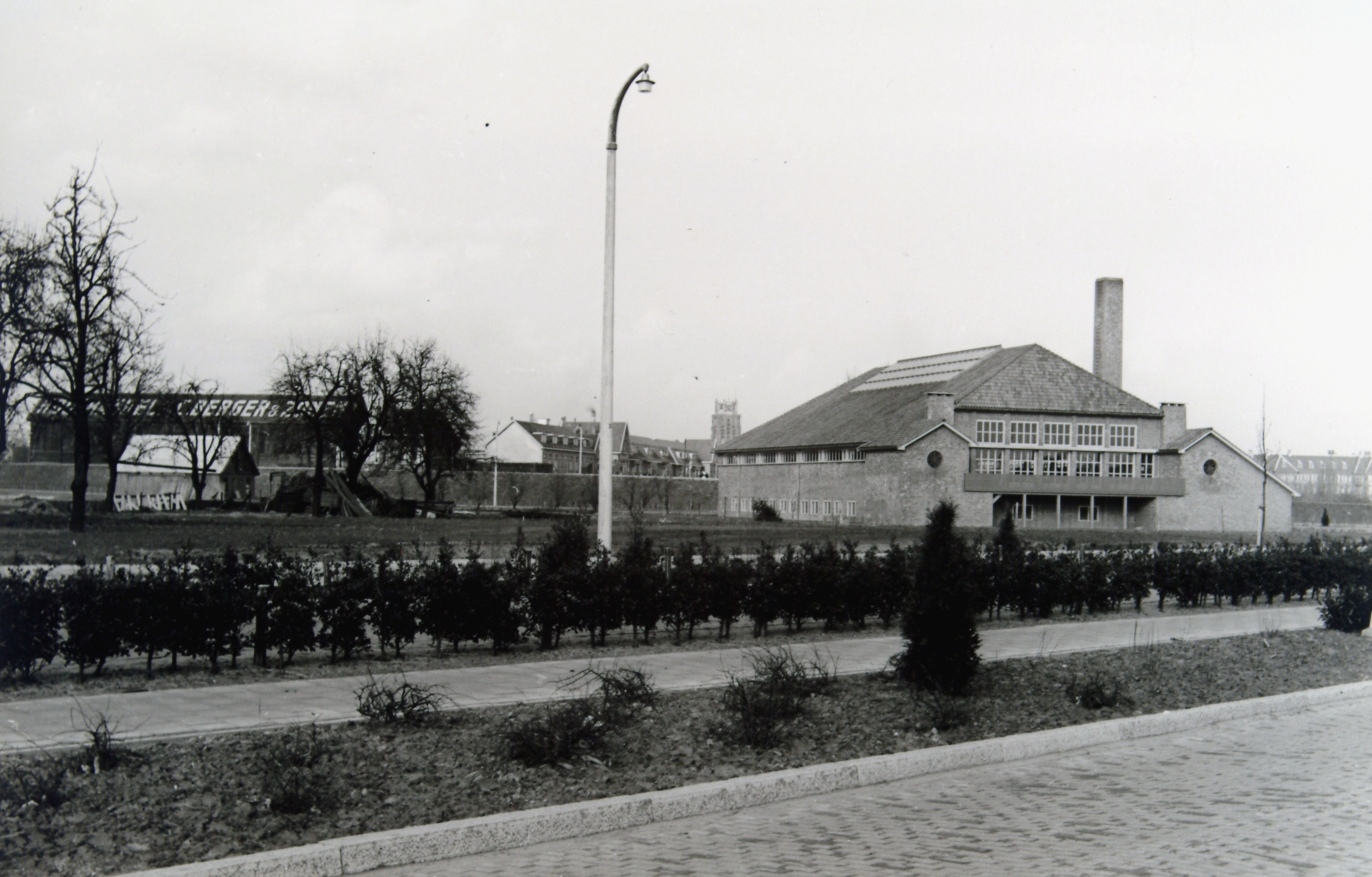 - Sportfondsenbad aan de Brandt Buysstraat gezien vanaf de Hugo de Grootlaan. Links de loods van houthandel Berger.