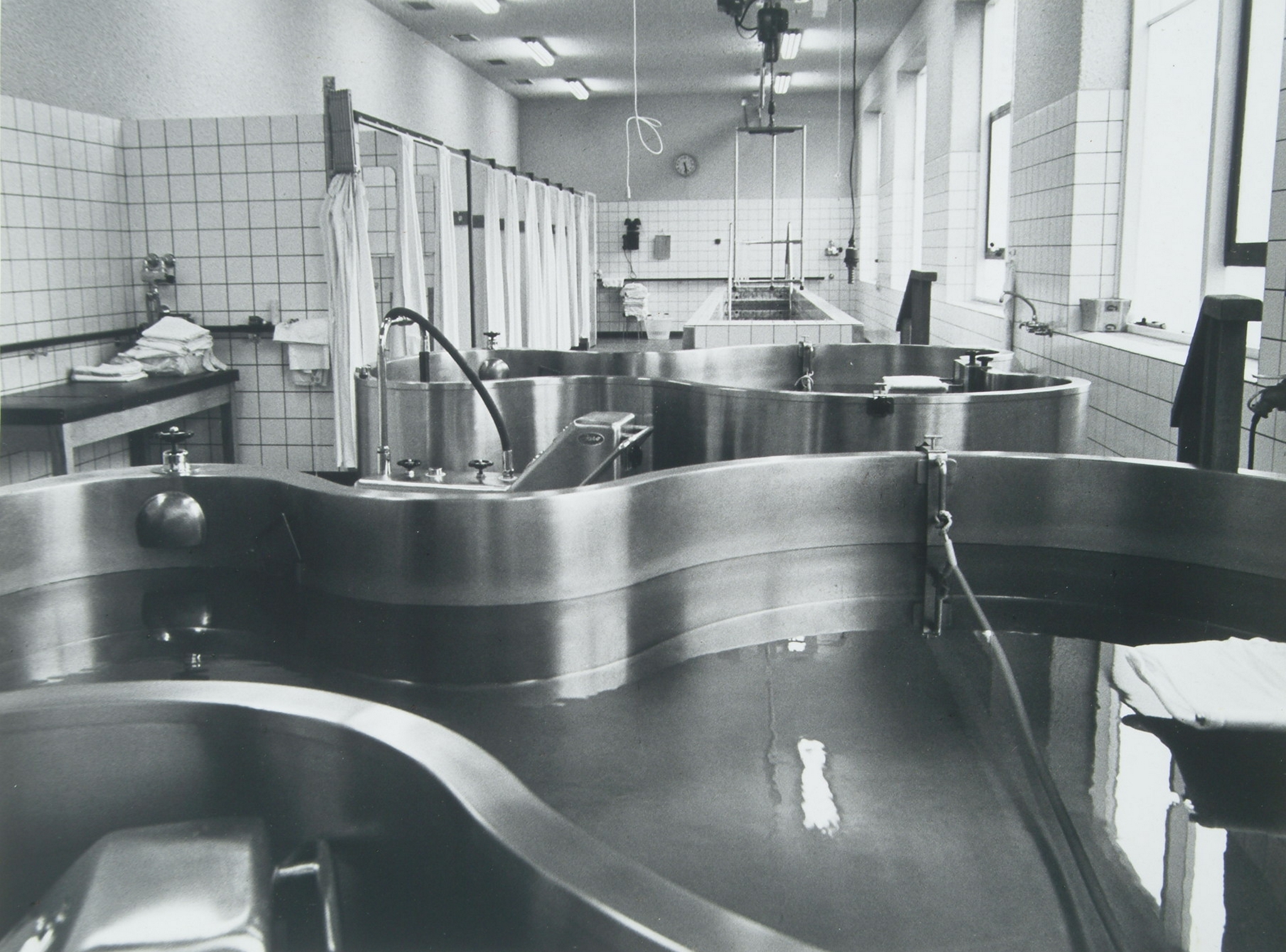Badkamer met vlinderbaden voor fysiotherapie in het Gemeenteziekenhuis in de Bankastraat.