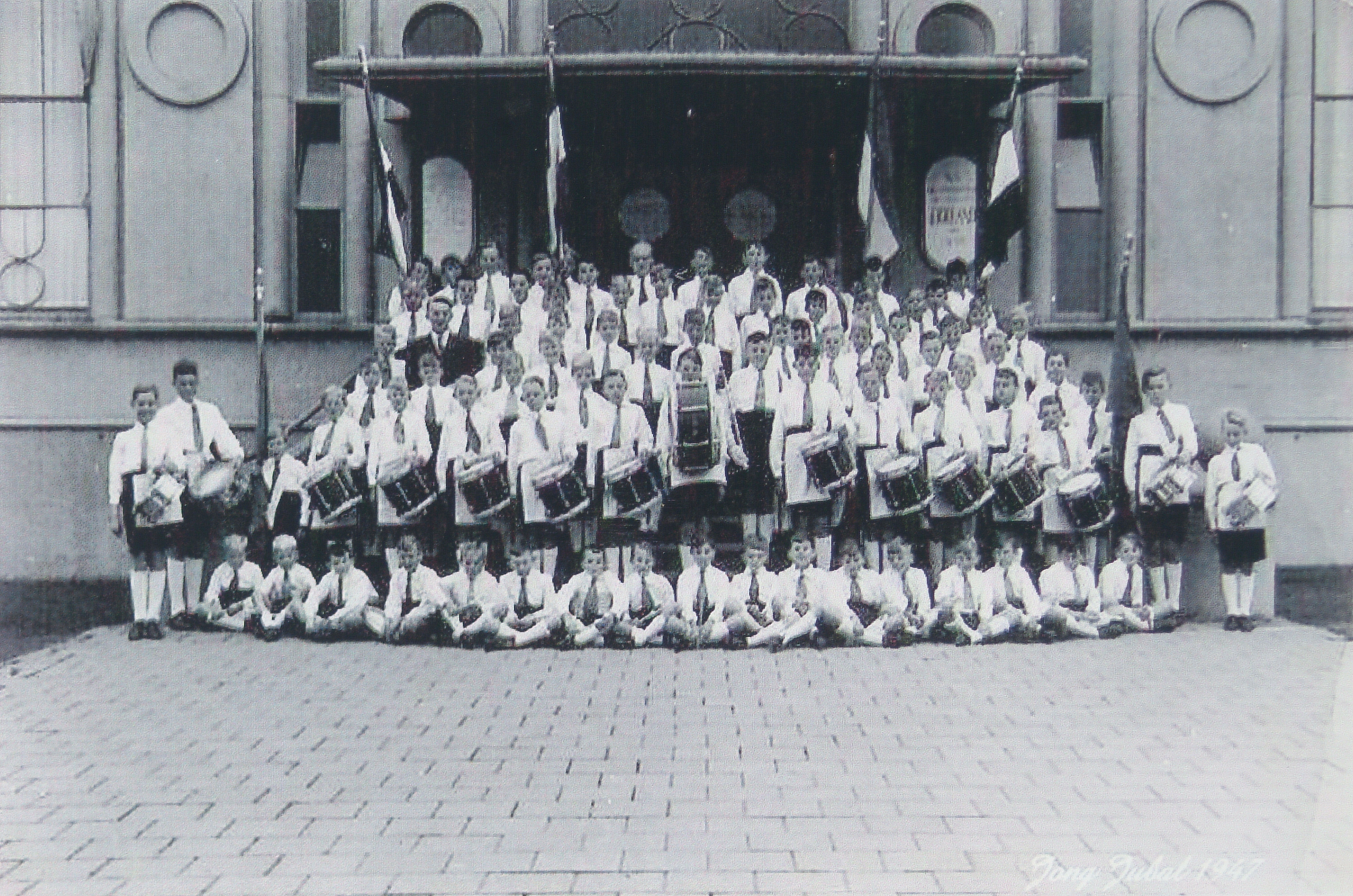 Groepsportret van het tamboers- en pijperskorps Jubal en Jong Jubal voor het gebouw de Holland aan de Burgemeester de Raadtsingel ca.1947