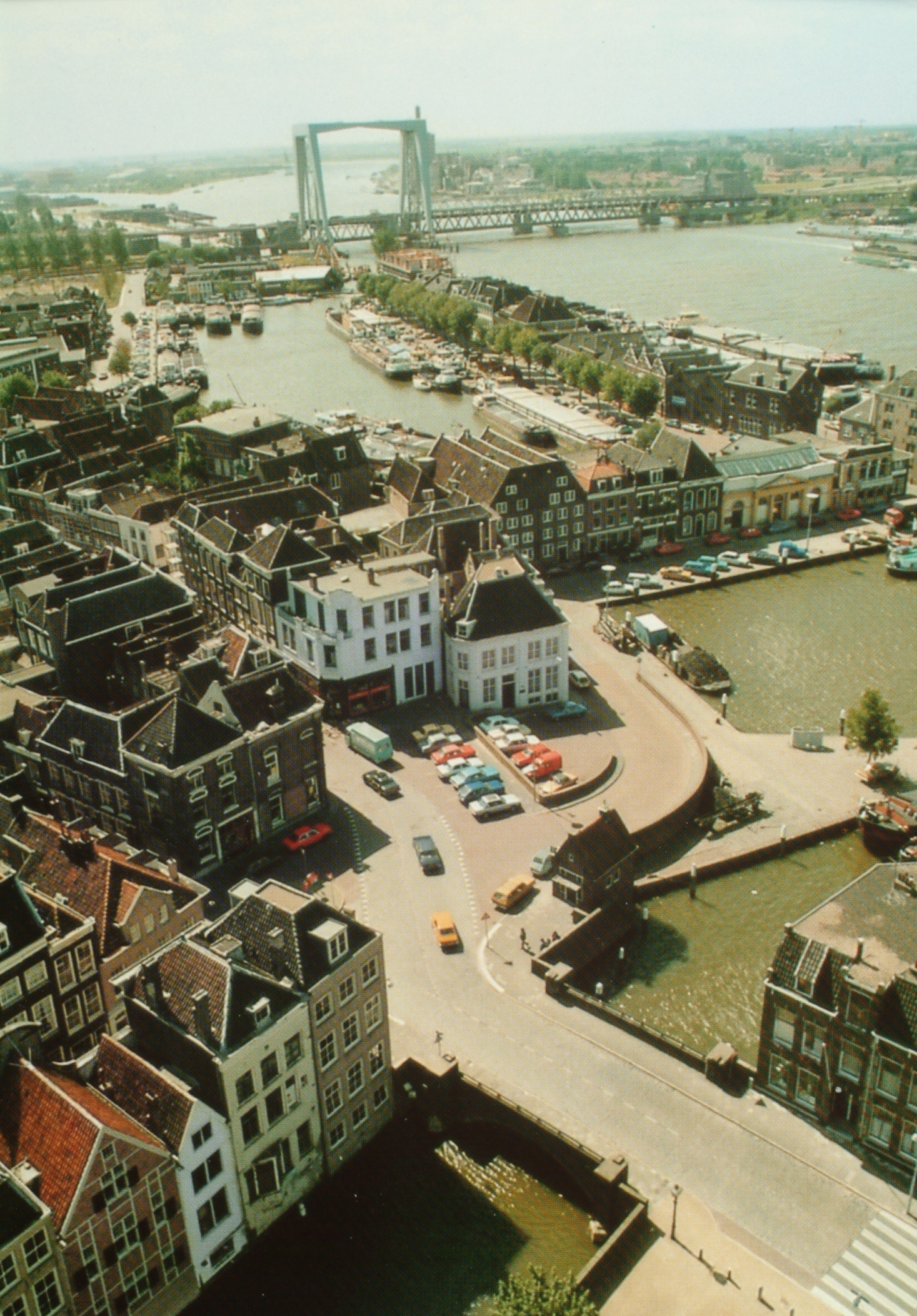 Gezicht vanaf de Grote Kerk op Oude Maas met Spoor- en Verkeersbrug (Zwijndrechtse bruggen).