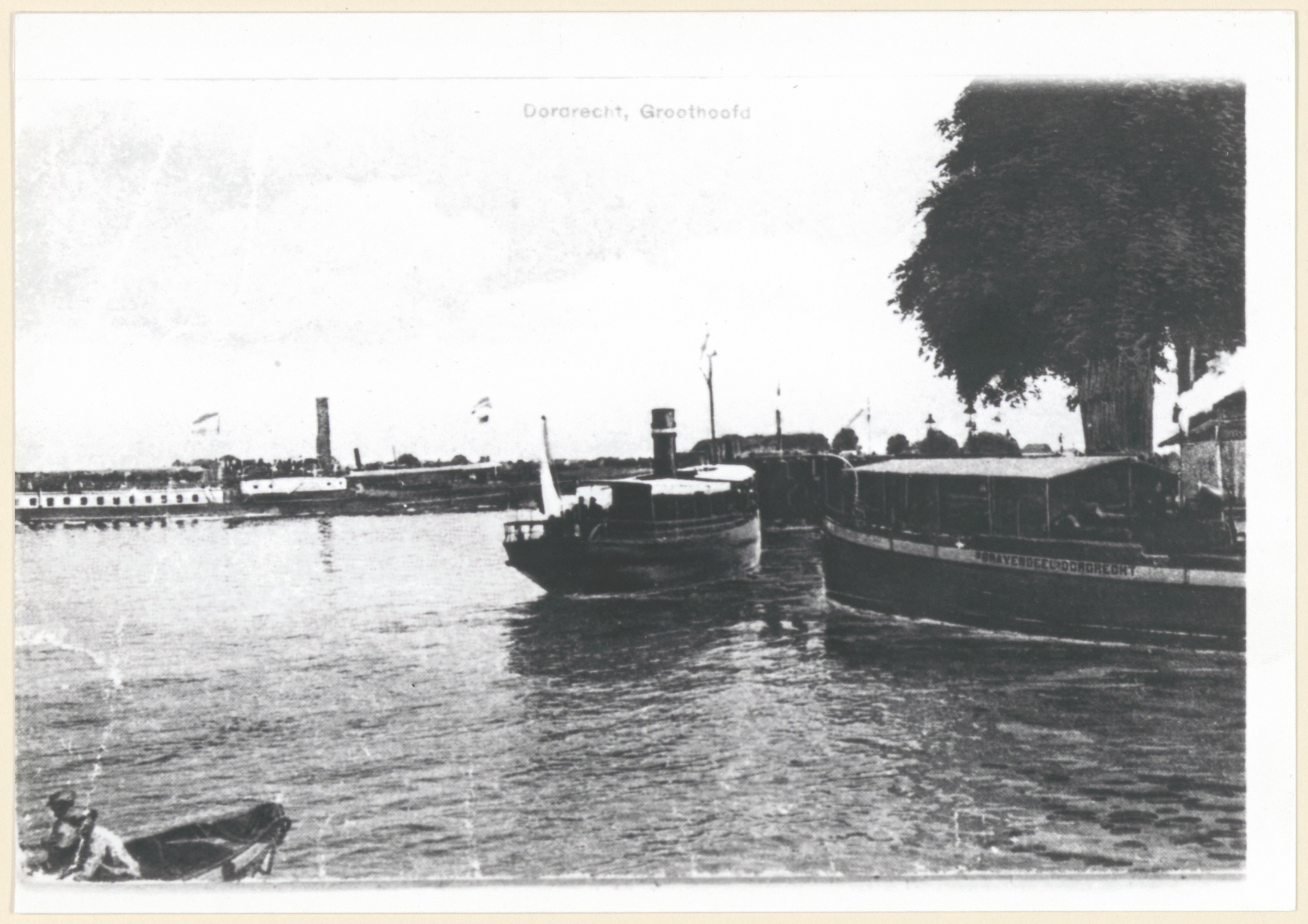 - Het Groothoofd vanaf het Damiatebolwerk. Aan de kade ligt een passagiersschip 's-Gravendeel - Dordrecht v.v.