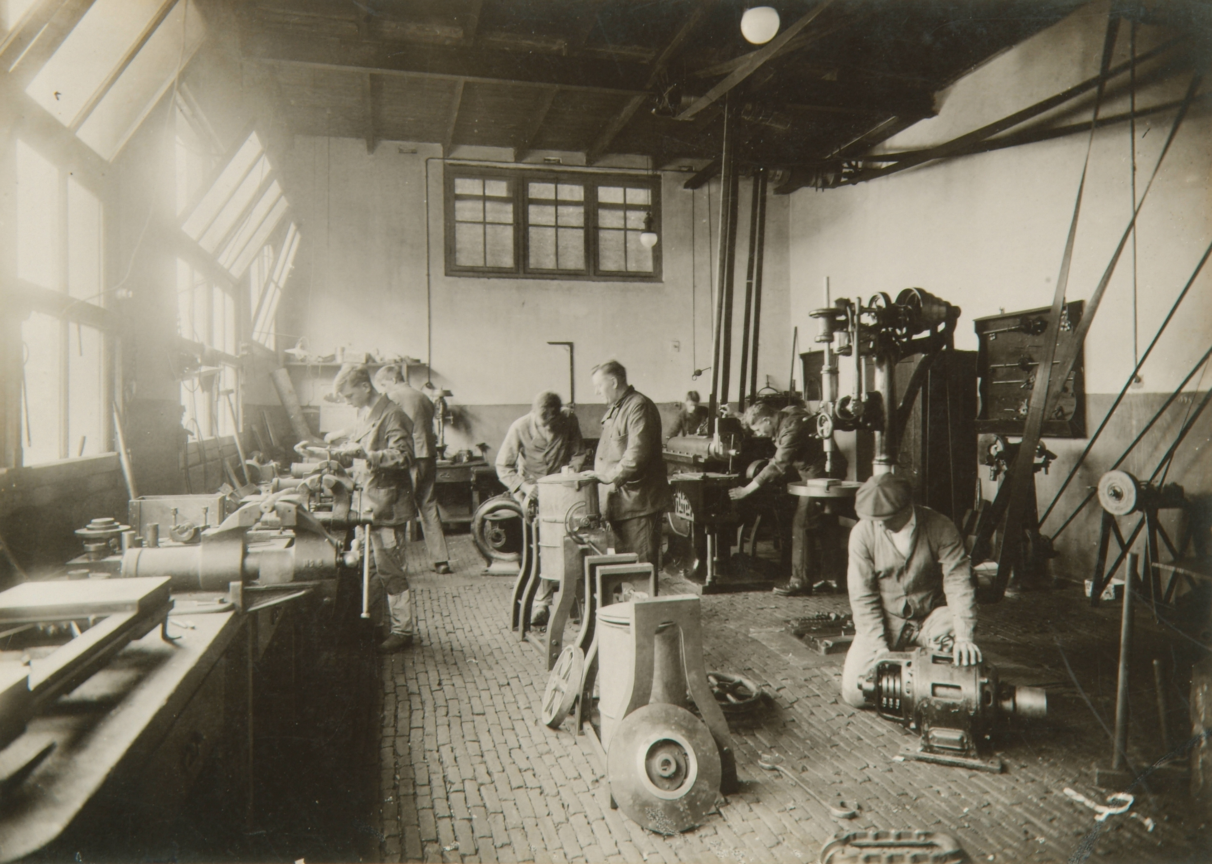 - De machinewerkplaats in de fabriek van Victoria aan de Korte Parallelweg.
