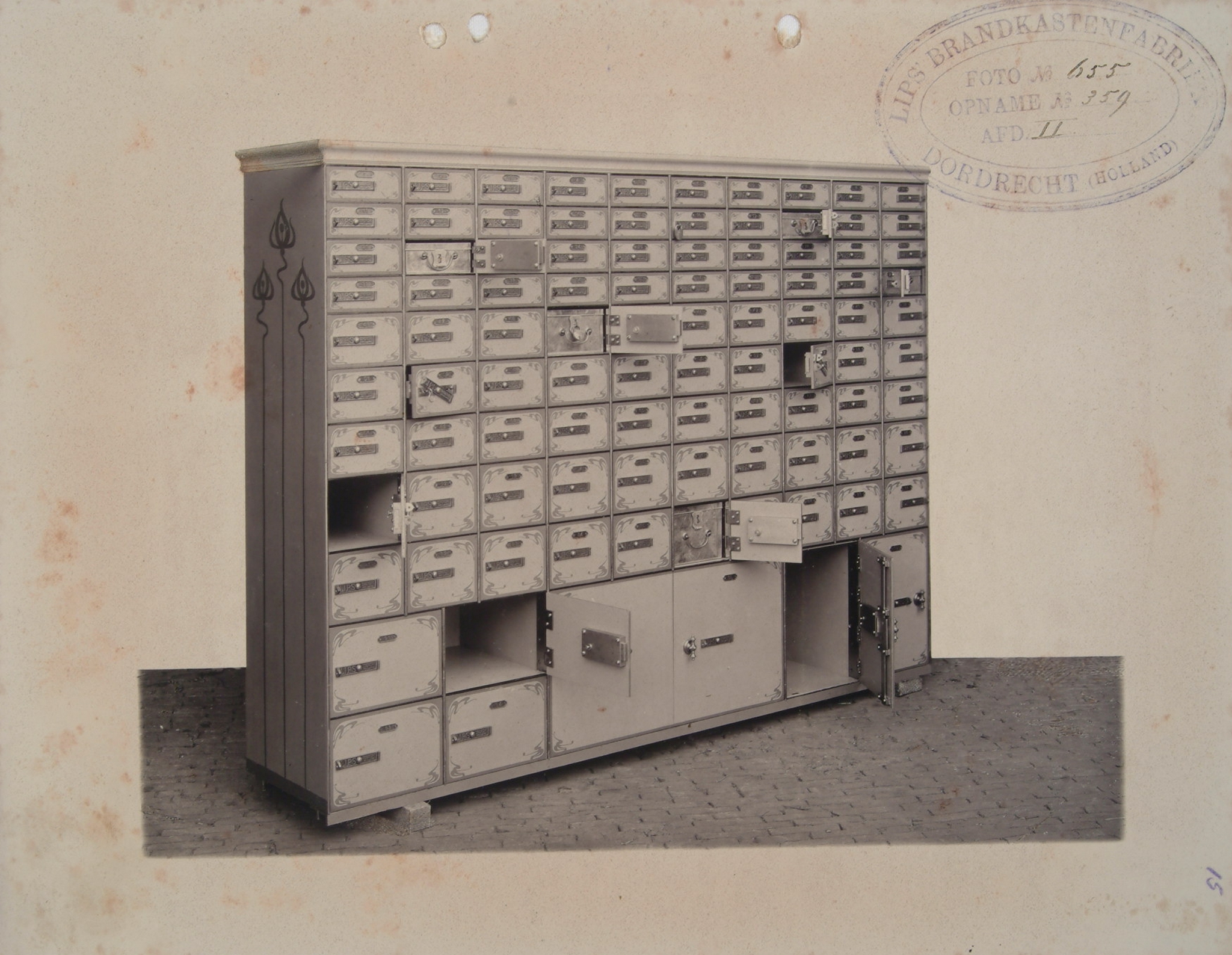 Verschillende soorten safekasten van de firma Lips enige zijn geplaatst in de Banque de Reports te Antwerpen
