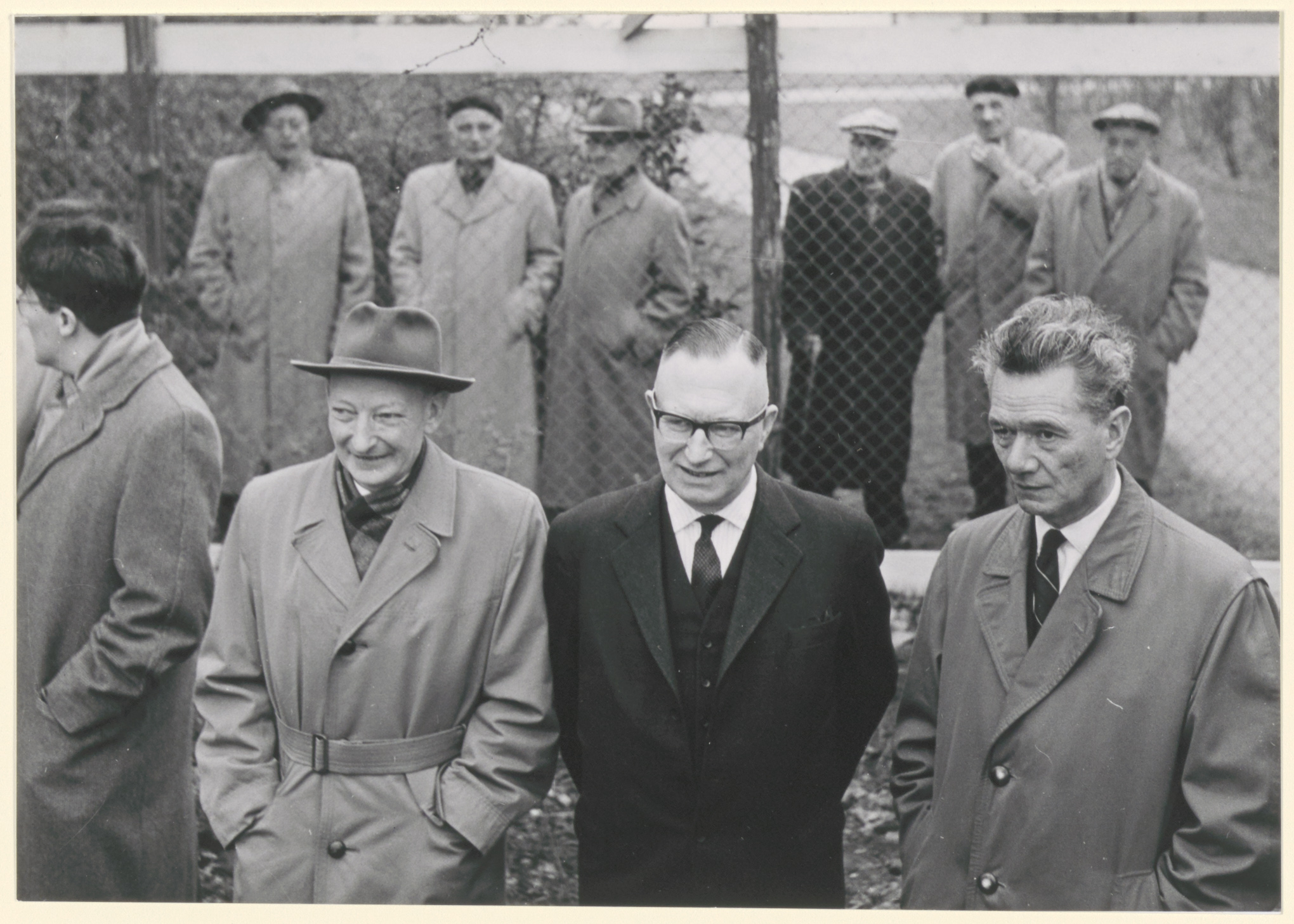 - Genodigden bij het slaan van de eerste paal voor de nieuw te bouwen Wepsterschool aan de Krommedijk, hoek Crayensteynstraat. V.ln.r. dhr. Muste (hoofd van de school), dhr P. Koopman, wethouder Van Es.