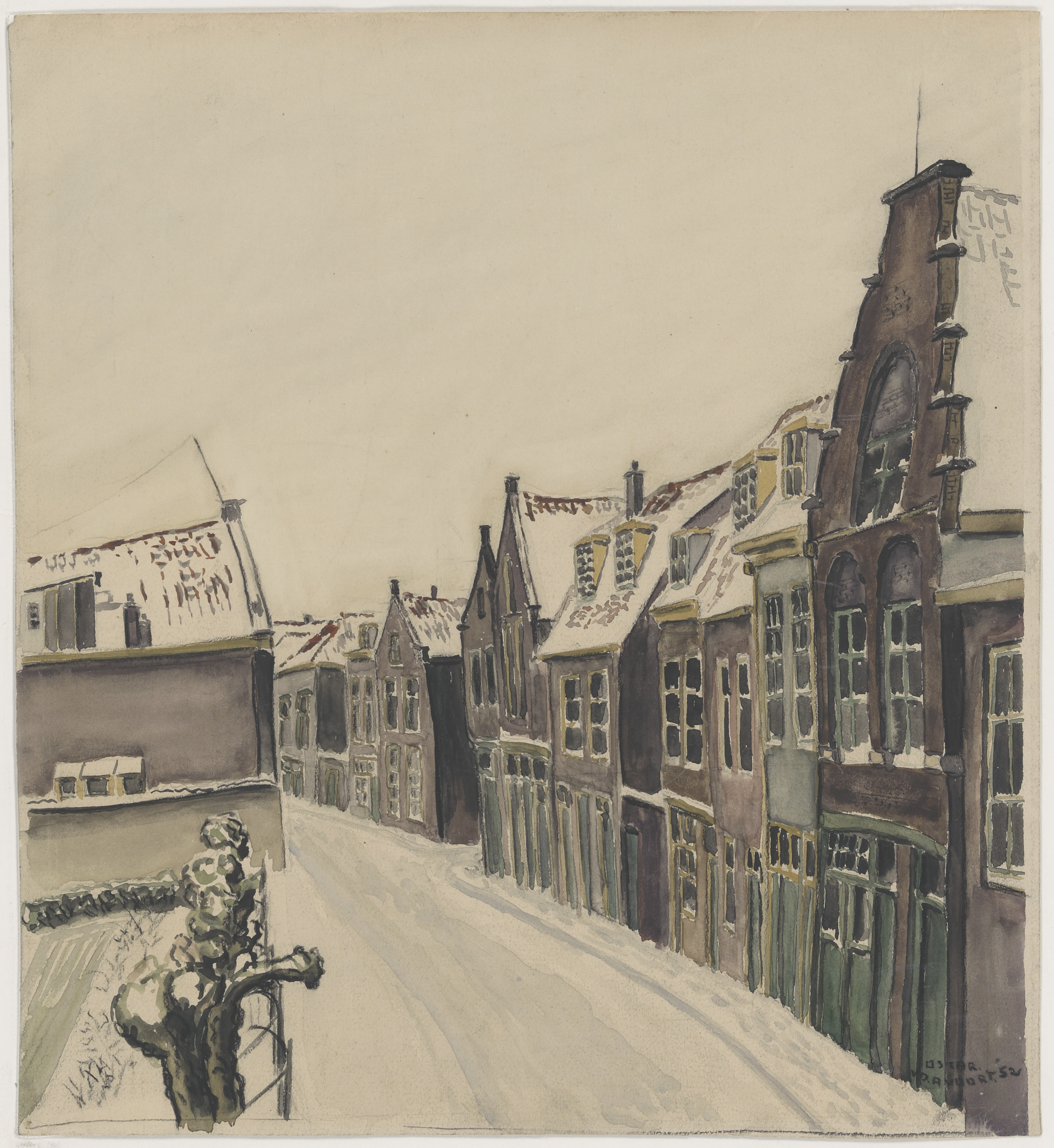 - Besneeuwd Augustijnenkamp gezien vanuit een huis aan de Nieuwstraat.