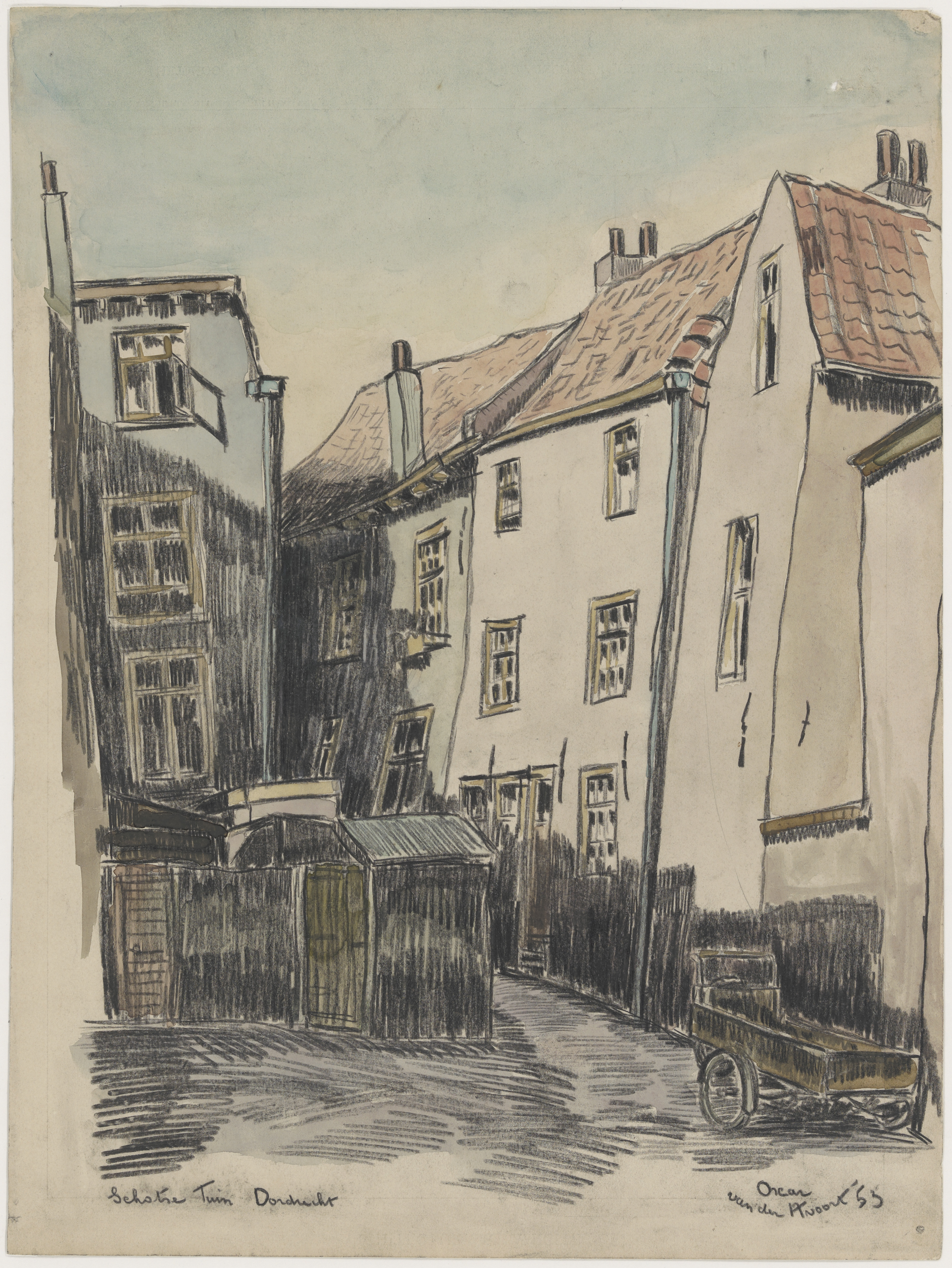 - tekening in krijt en waterverf in kleur