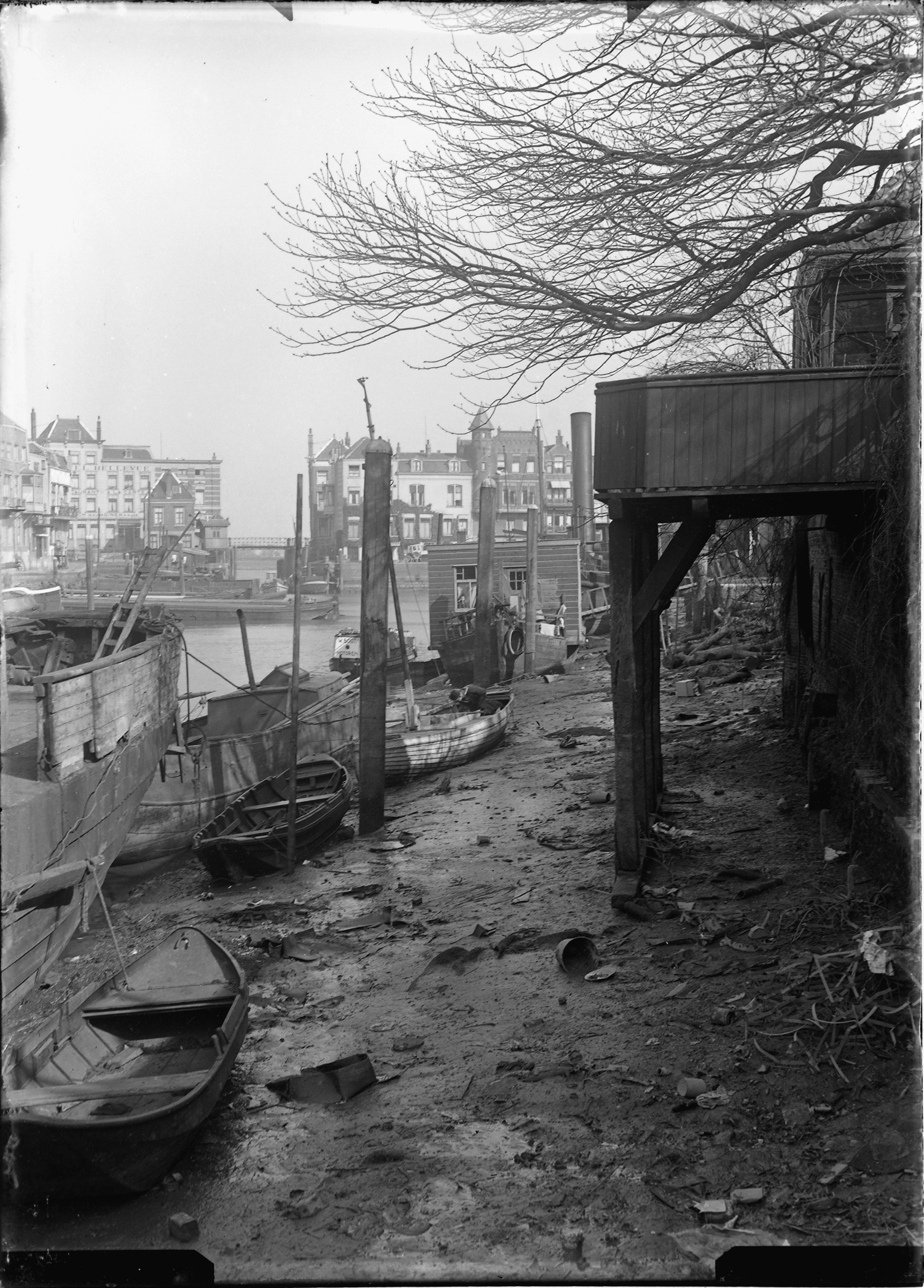 Laag water in de Wijnhaven, ongeveer vanaf de Turfsteiger in noordelijke richting van Hotel Bellevue en Boombrug gezien. Op de achtergrond rechts van het midden panden aan de Taankade.