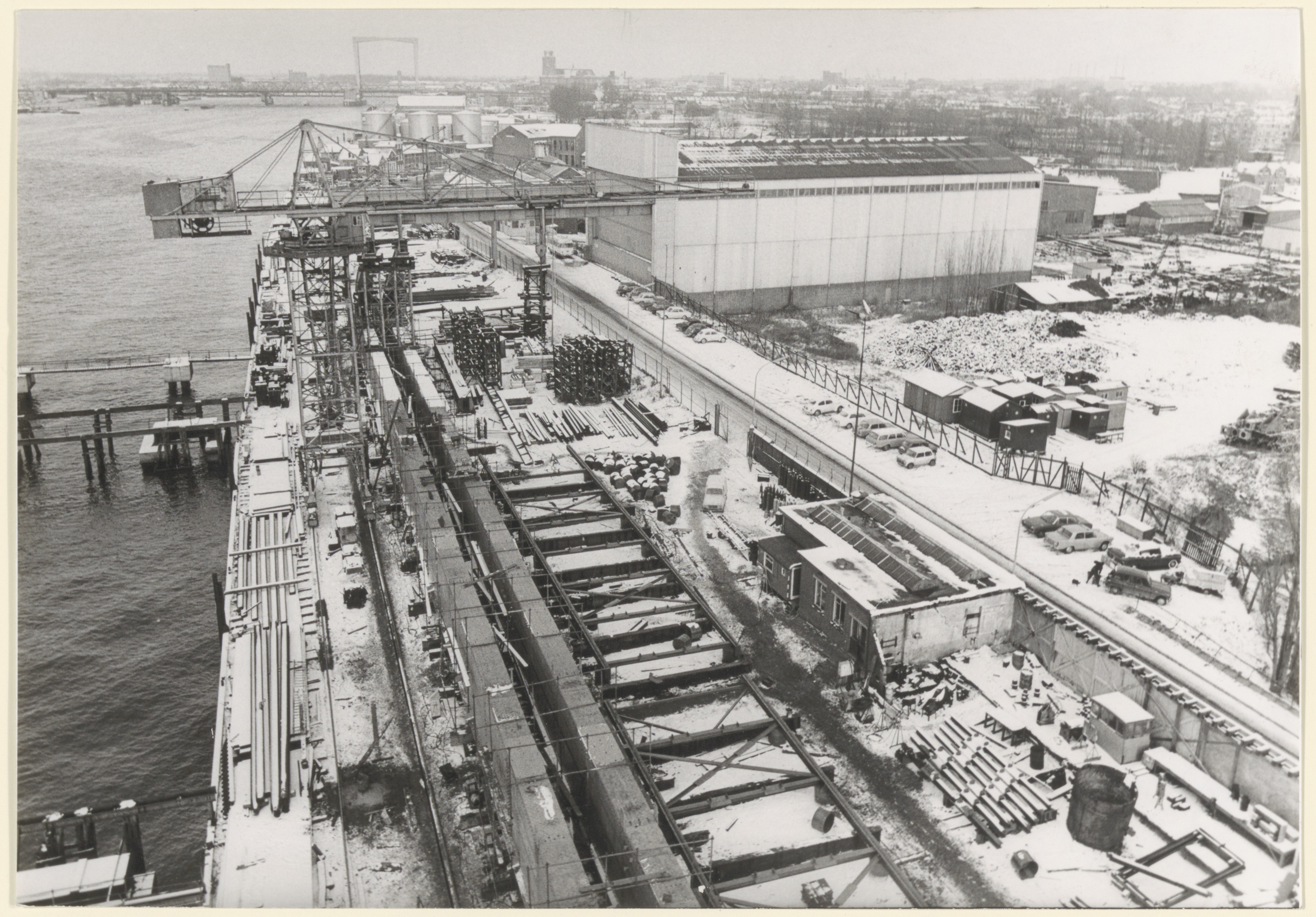 - Het met sneeuw bedekte terrein van fa. Penn & Bauduin aan de 's-Gravendeelsedijk. Links het Mallegat.