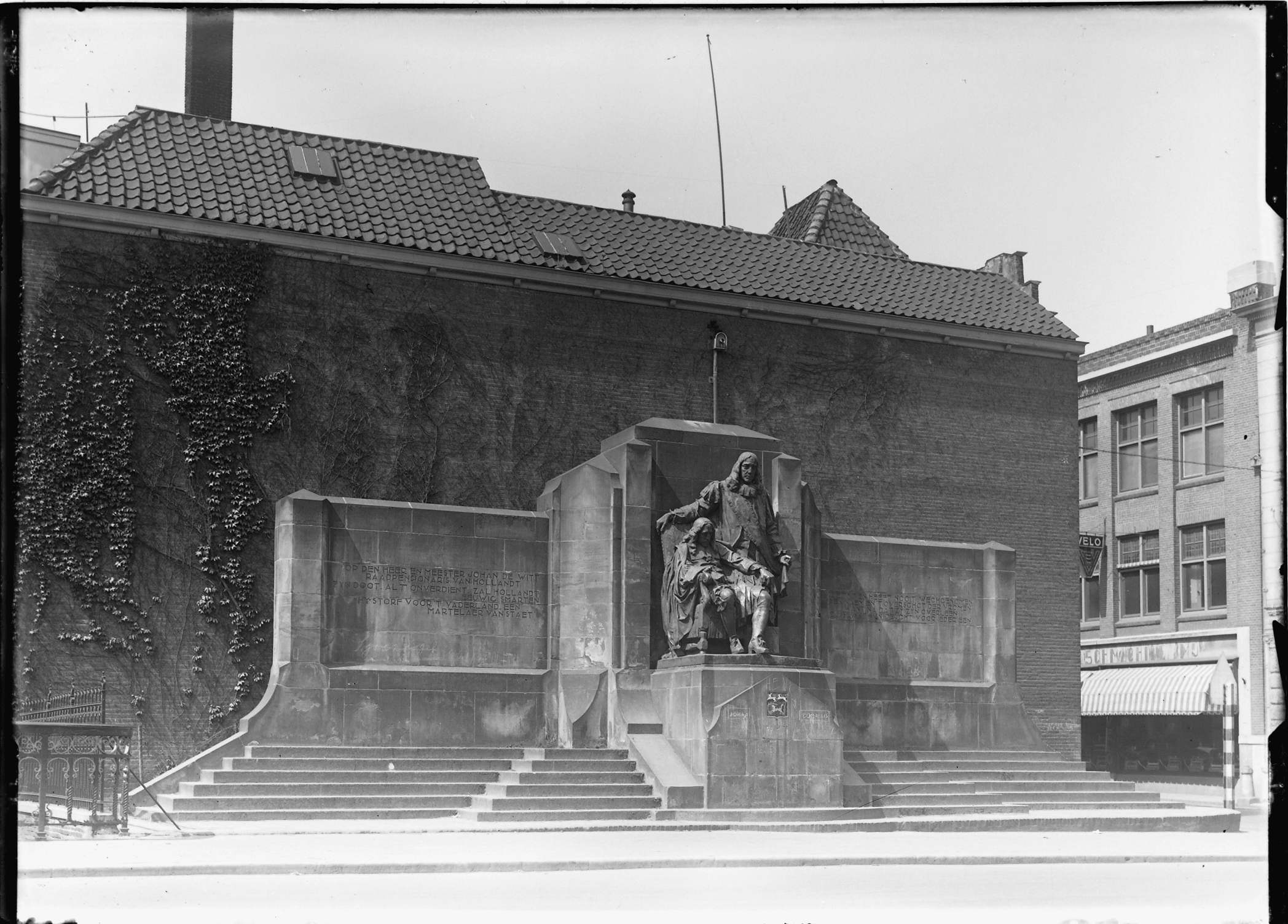 - Standbeeld van Johan en Cornelis de Witt op de Visbrug. Rechts is de Groenmarkt.