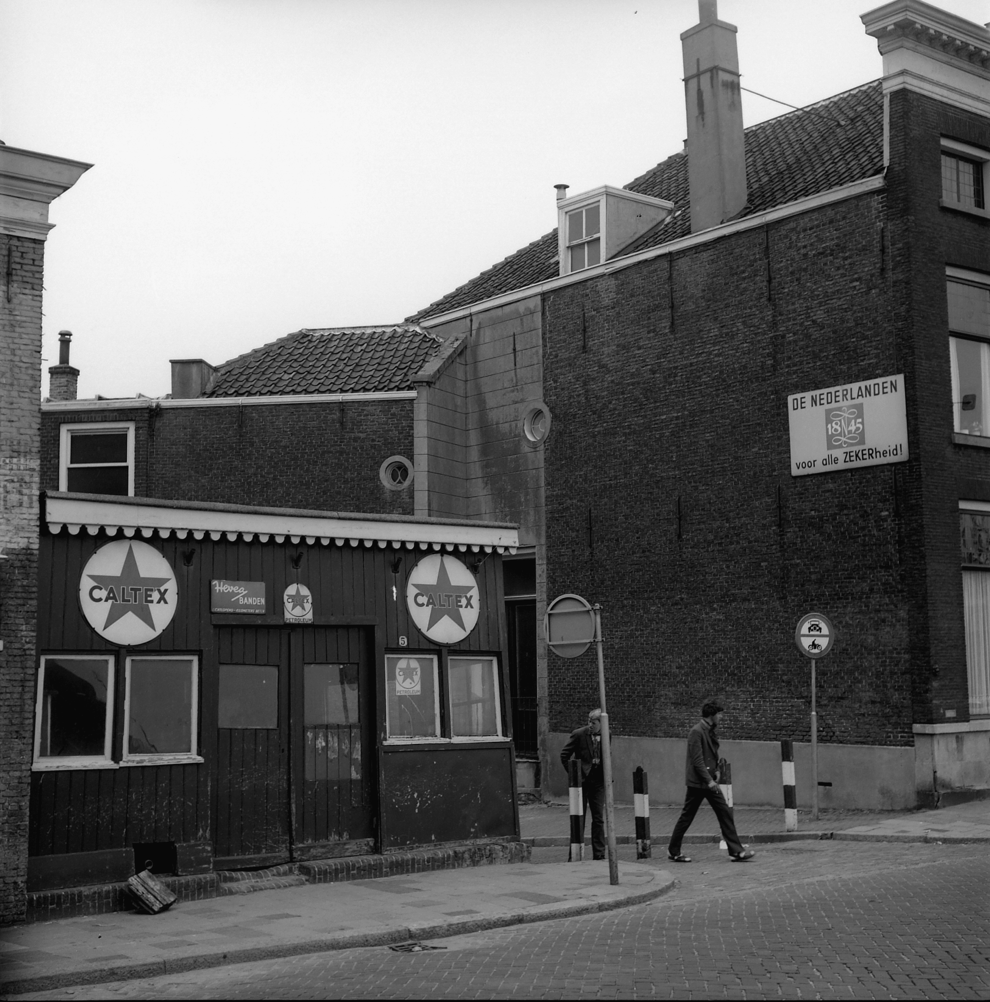 Handel en winkel er naast van J. A. de Roo. Vest nummer 5 en 7 de benzinepomp aan de overkant van de straat. Dochter van J.A: de Roo