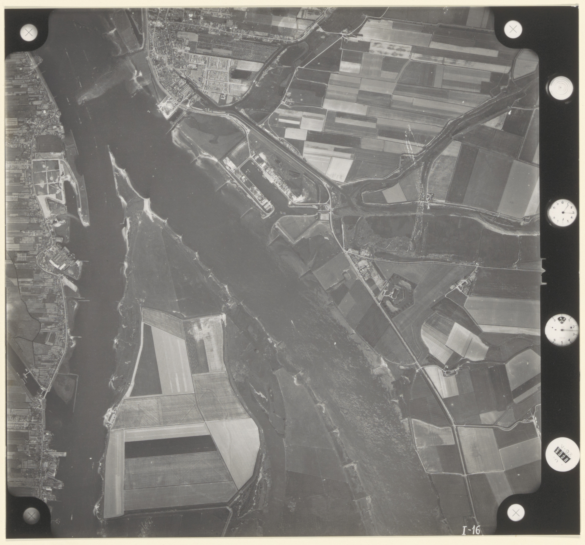 De splitsing van de Boven Merwede in de Beneden Merwede (linksboven) en de Nieuwe Merwede (linksonder), waartussen de oostelijke punt van het Eiland van Dordrecht; rechts Werkendam, onder de Kievitswaard, boven delen van Boven- en Neder-Hardinxveld.