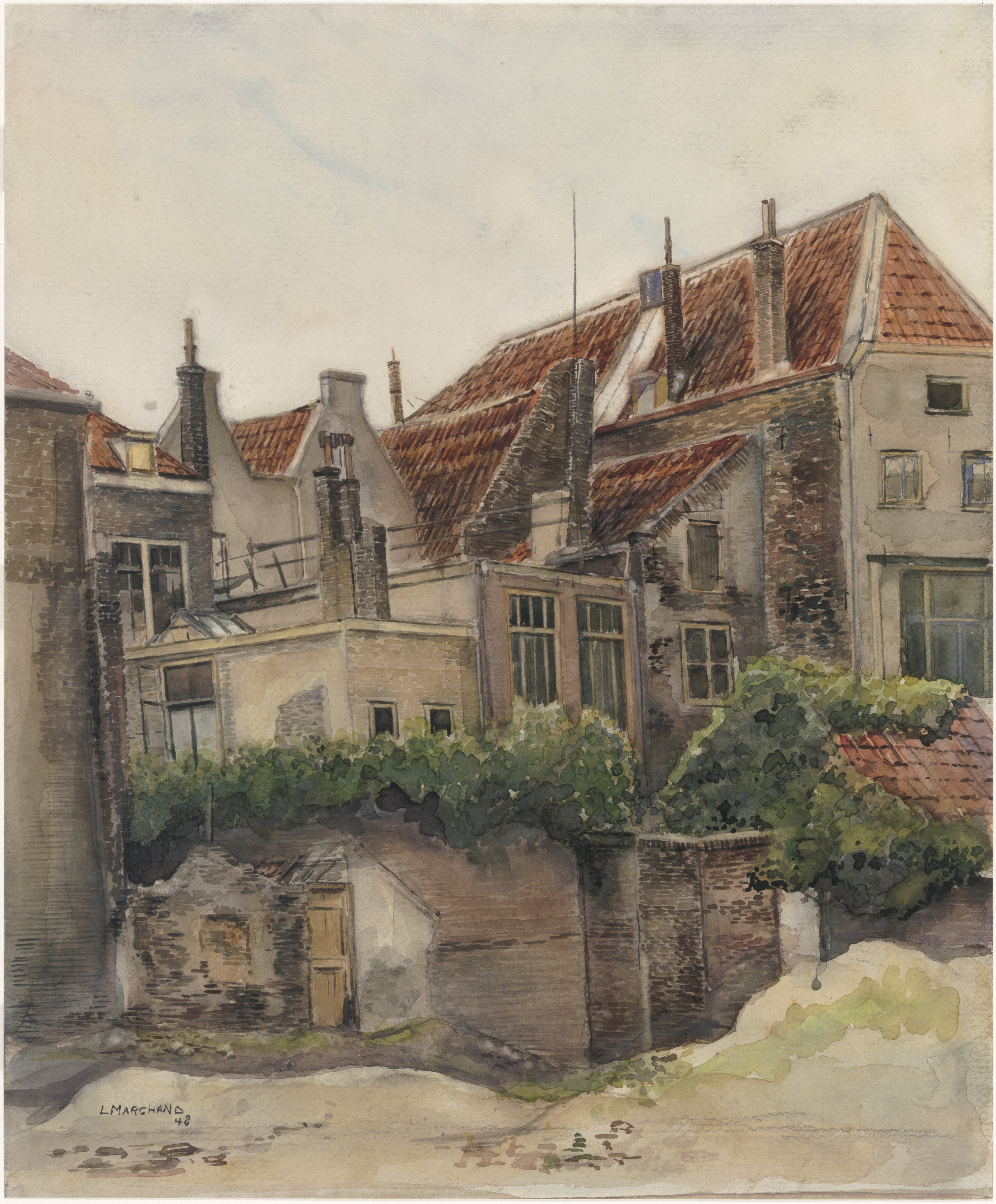 - Voorstraat Gezicht op de achterzijde der bebouwing aan de landzijde der Voorstraat tussen de Riedijk en de Torenstraat, 1948.