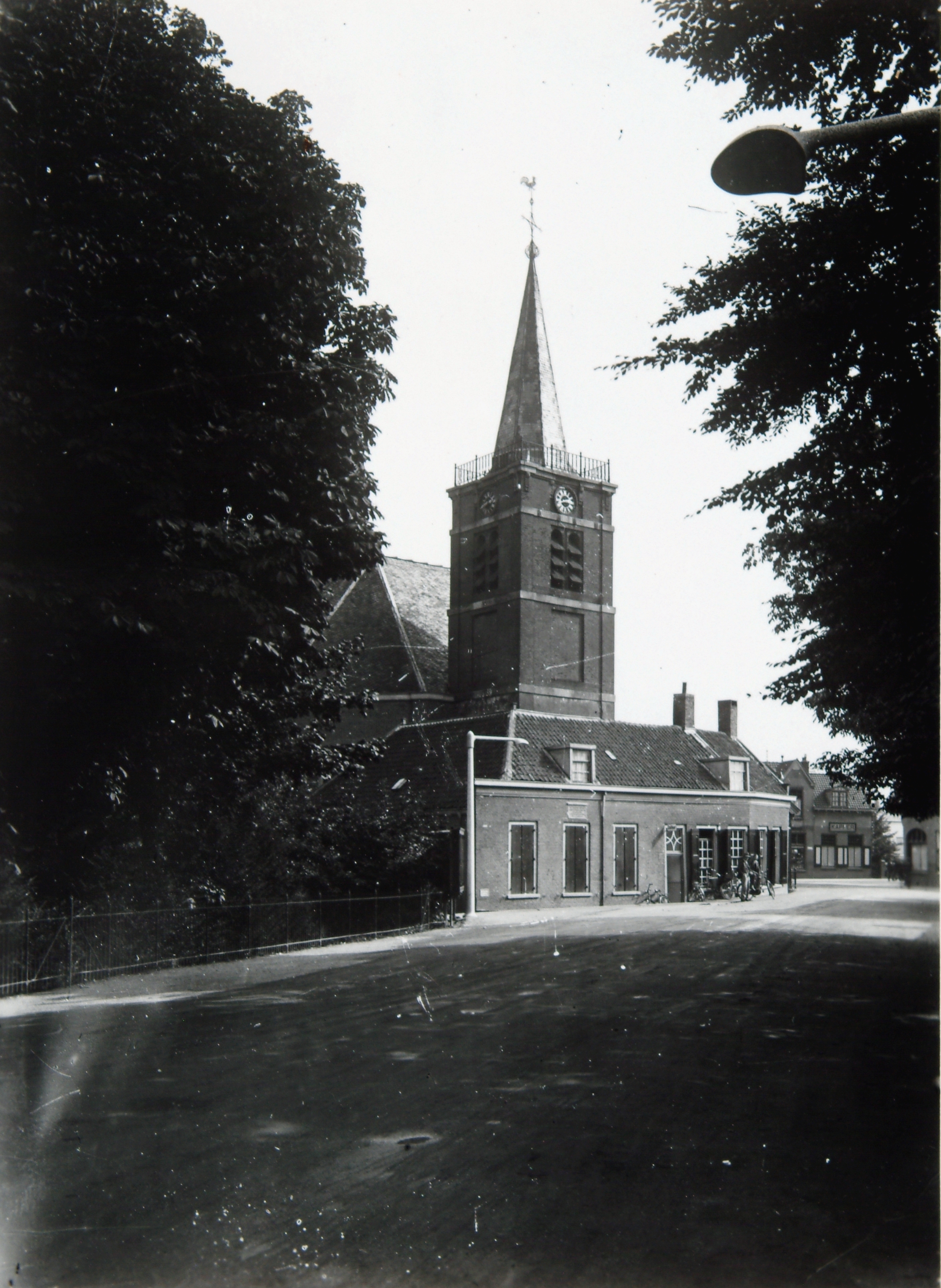 De hervormde kerk op de hoek van de dijk en de Stationsweg in Sliedrecht,gezien in oostelijke richting.