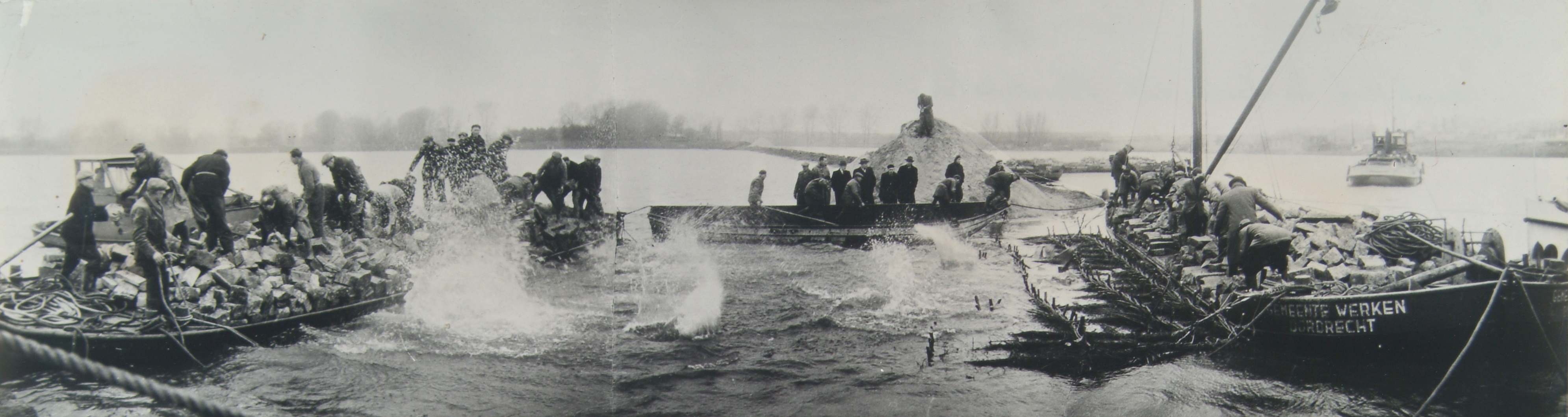 Neerlaten van een zinkstuk in de doorgebroken Wantijdijk van de Stadspolder