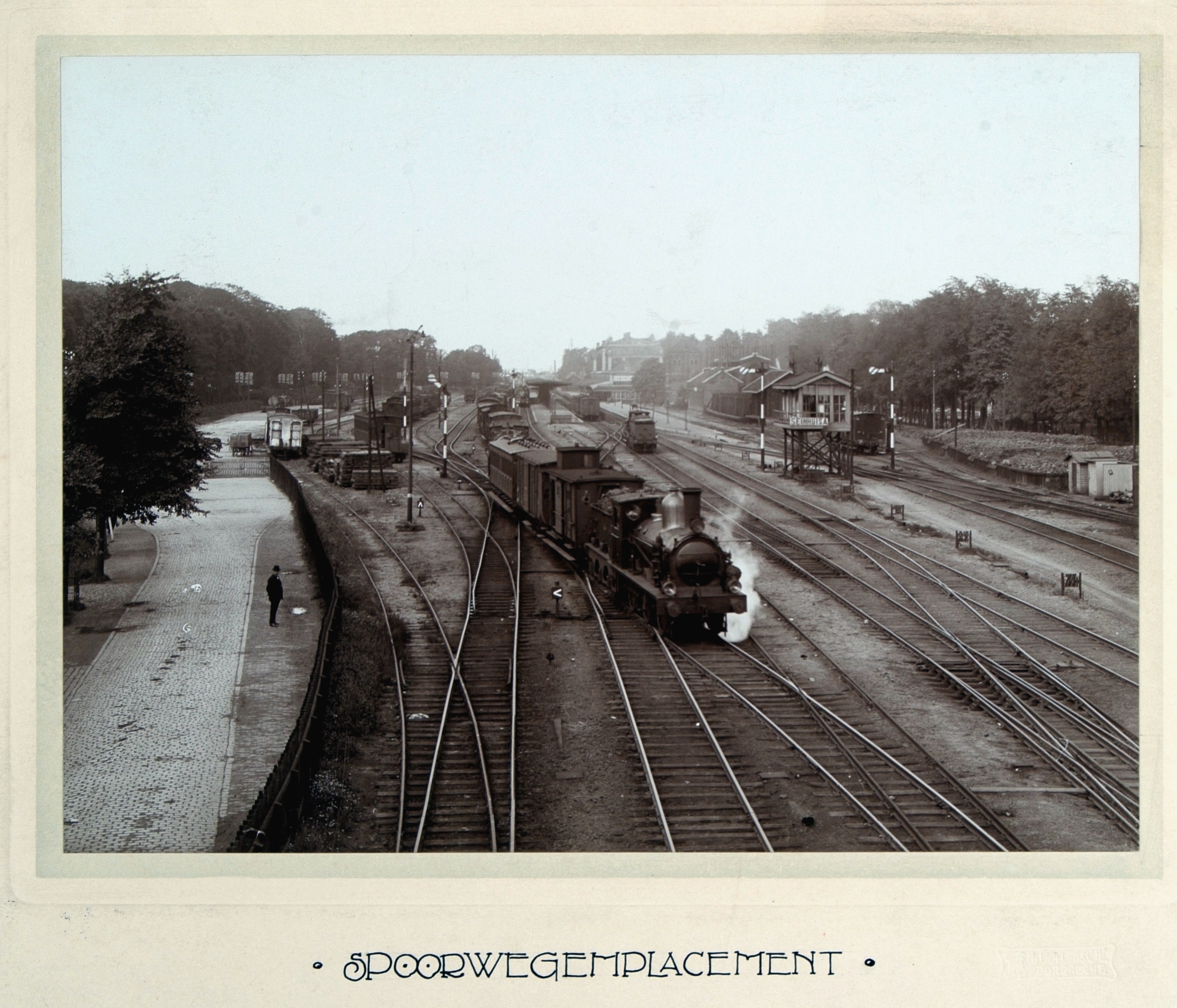 - Het spoorwegemplacement tussen de Markettenweg (links) en de Burgemeester de Raadtsingel, gezien naar het westen.