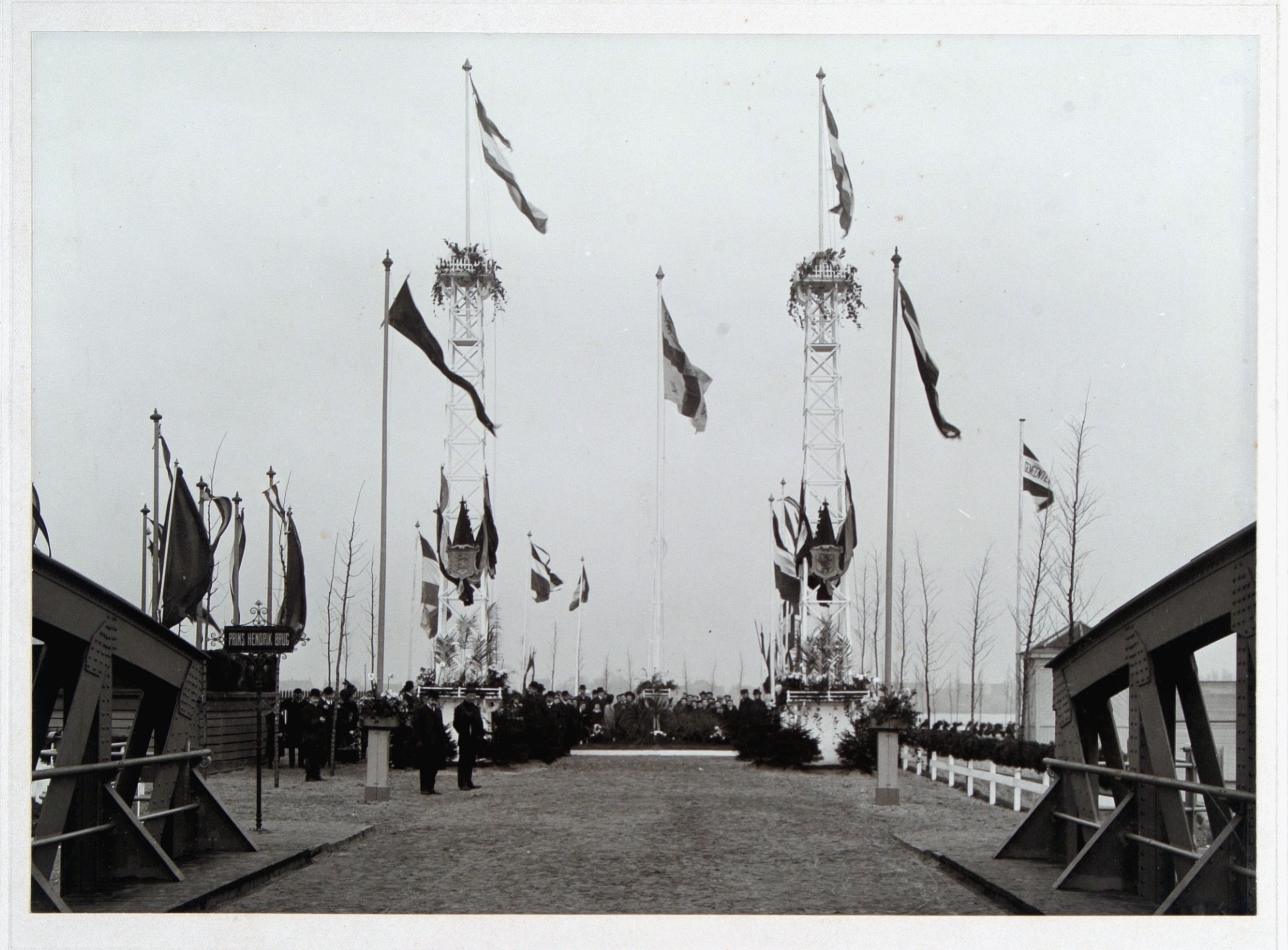 Obelisken en vlaggen bij de opening van de Prins Hendrikbrug.