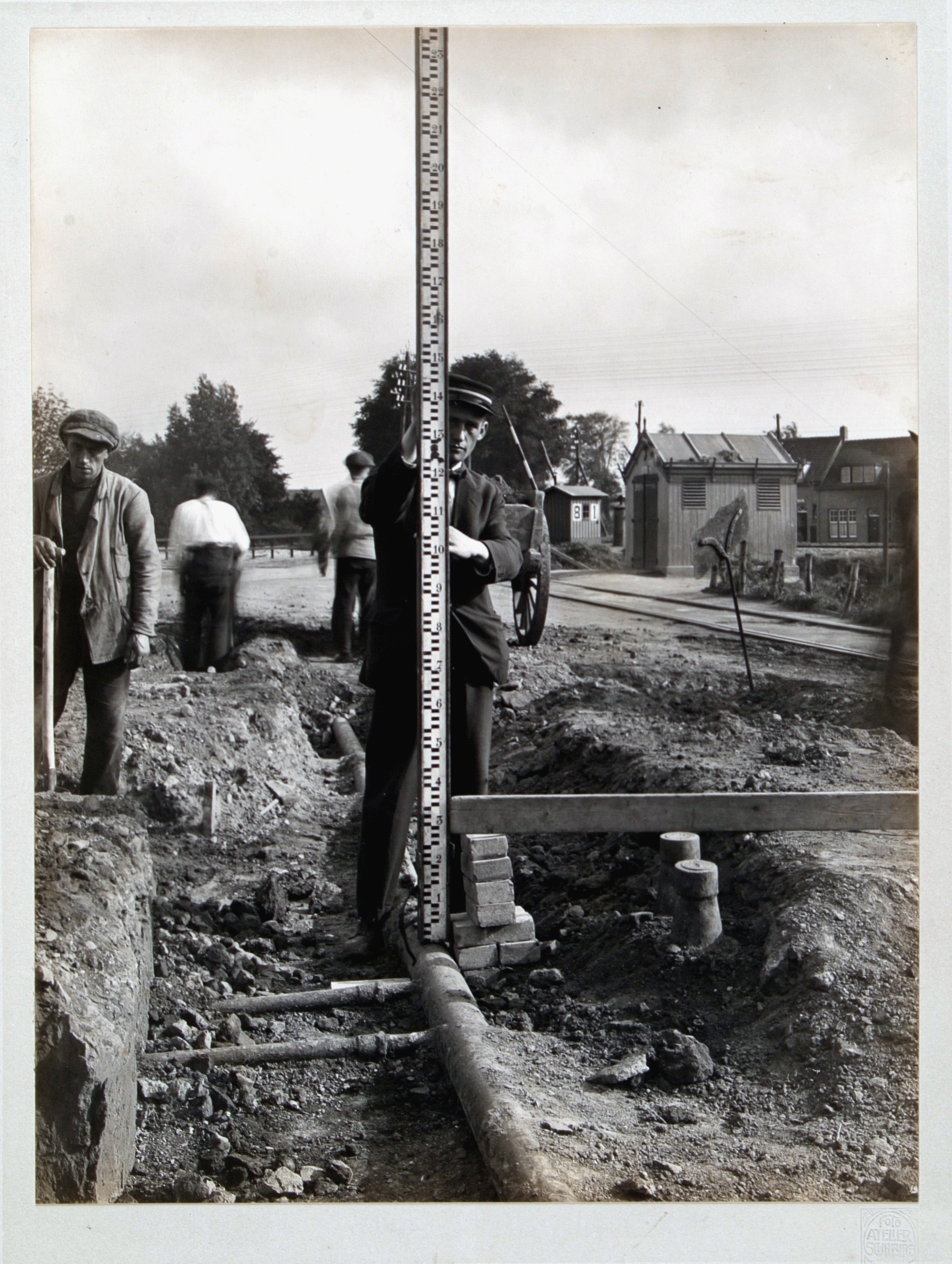 - Een landmeter bij het op hoogte brengen van de waterleidingbuis bij de spoorwegovergang op de Krommedijk. De huizen op de achtergrond staan in de Crayensteynstraat. De spoorrails zijn voor de Lipstrein.