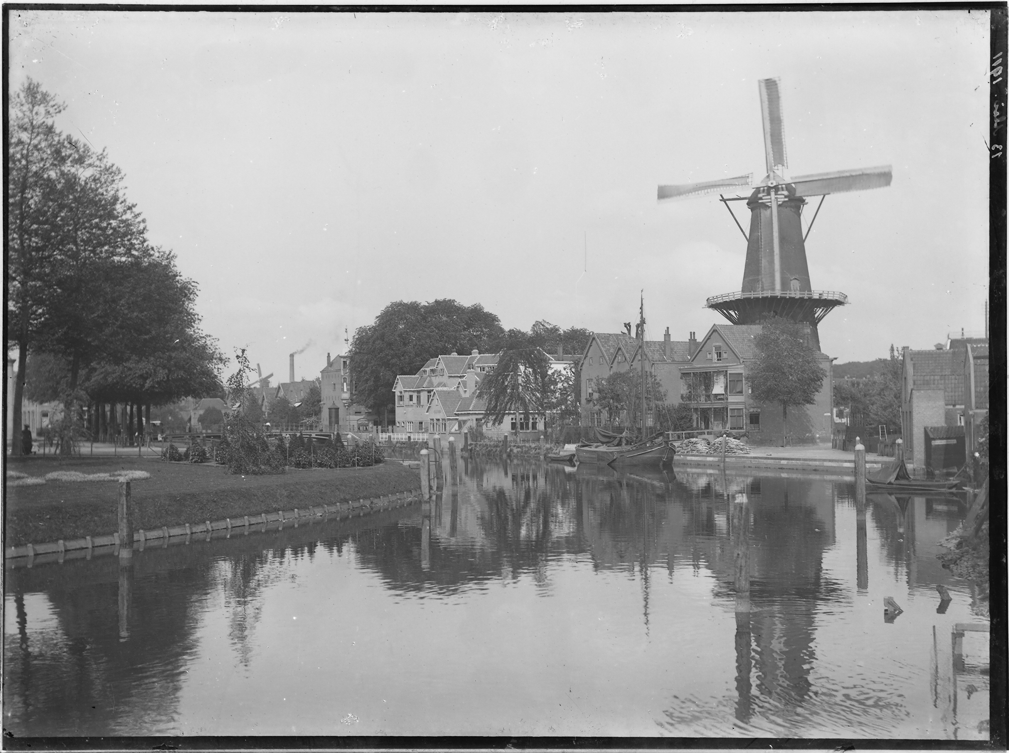 Gezicht vanaf de Johan de Wittbrug over de Spuihaven op molen de Maagd aan de Cornelis de Wittstraat; links de Vriesebrug