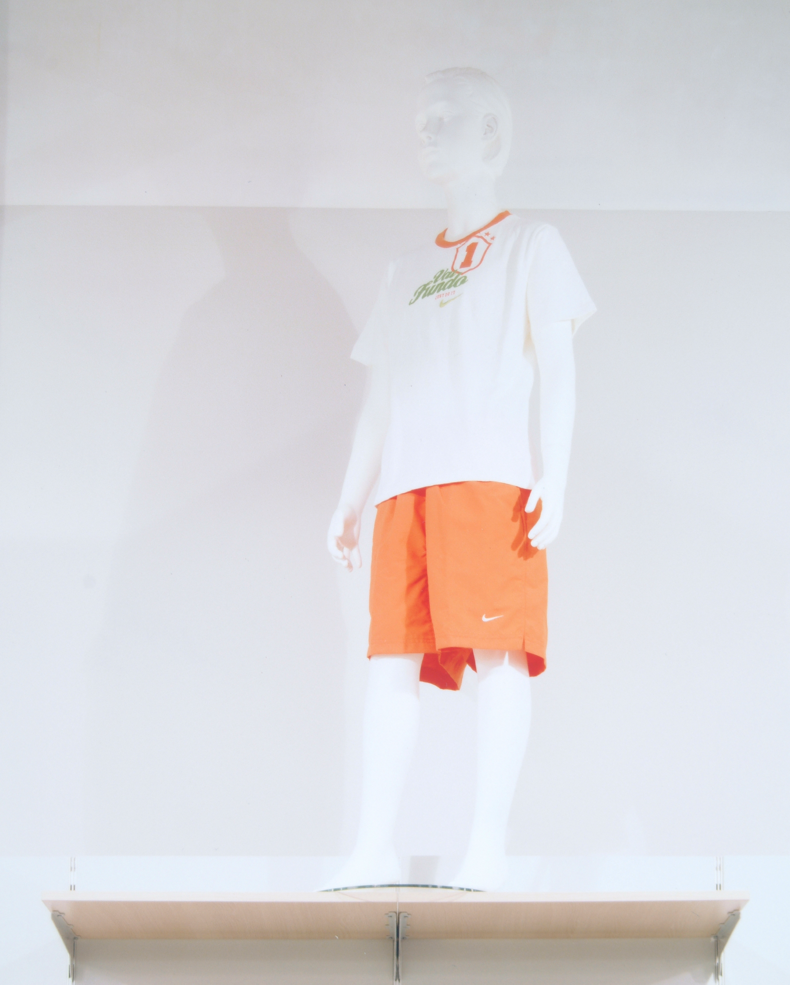 Etalagepop met sportkleding in de sportkledingwinkel Aktiesport in de voormalige Waalse …