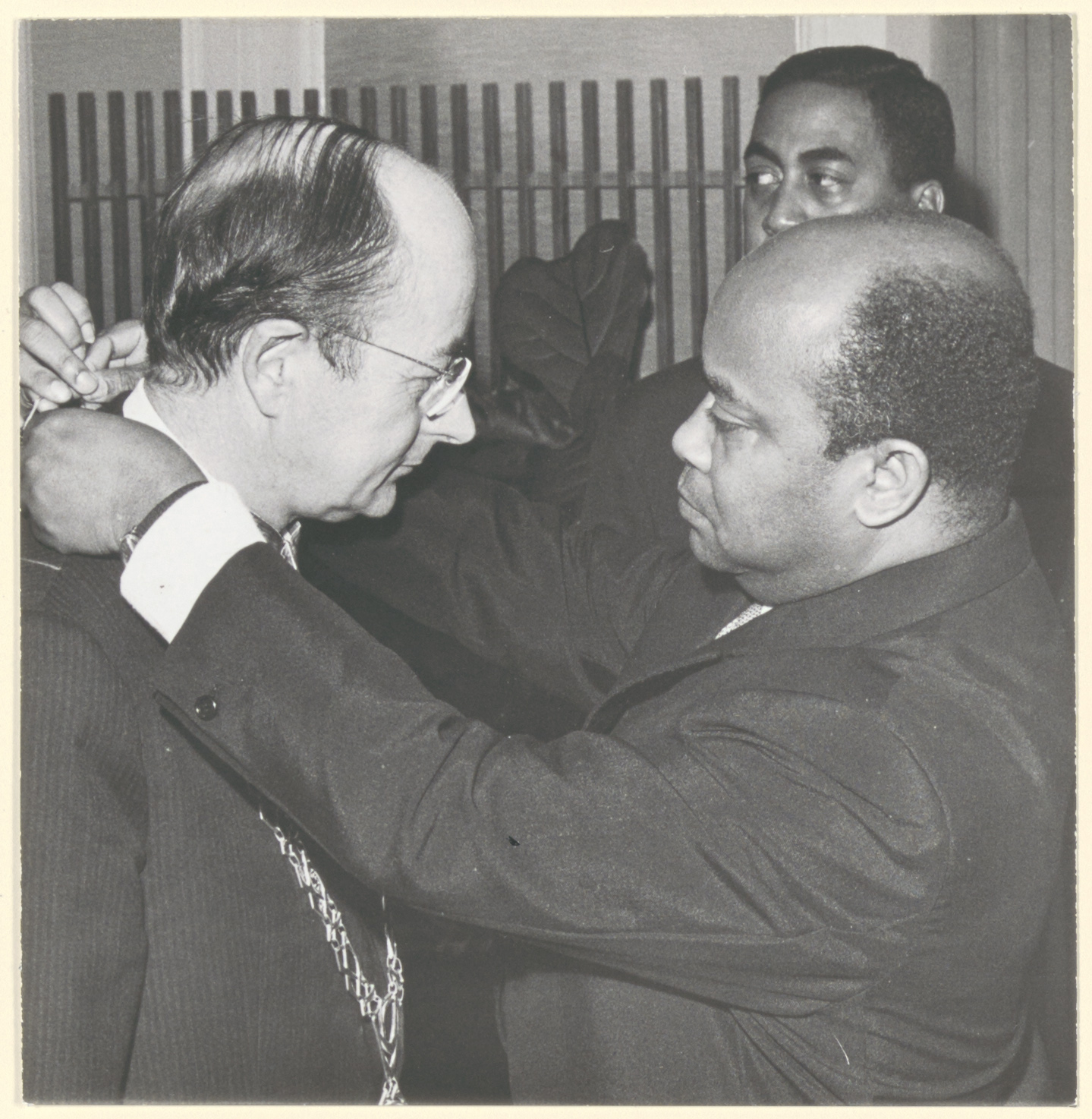 - Minister Jacques Rabemananjara hangt burgemeester mr. J.J. v.d. Lee het commandeurskruis in de nationale orde van de republiek Madagascar om.