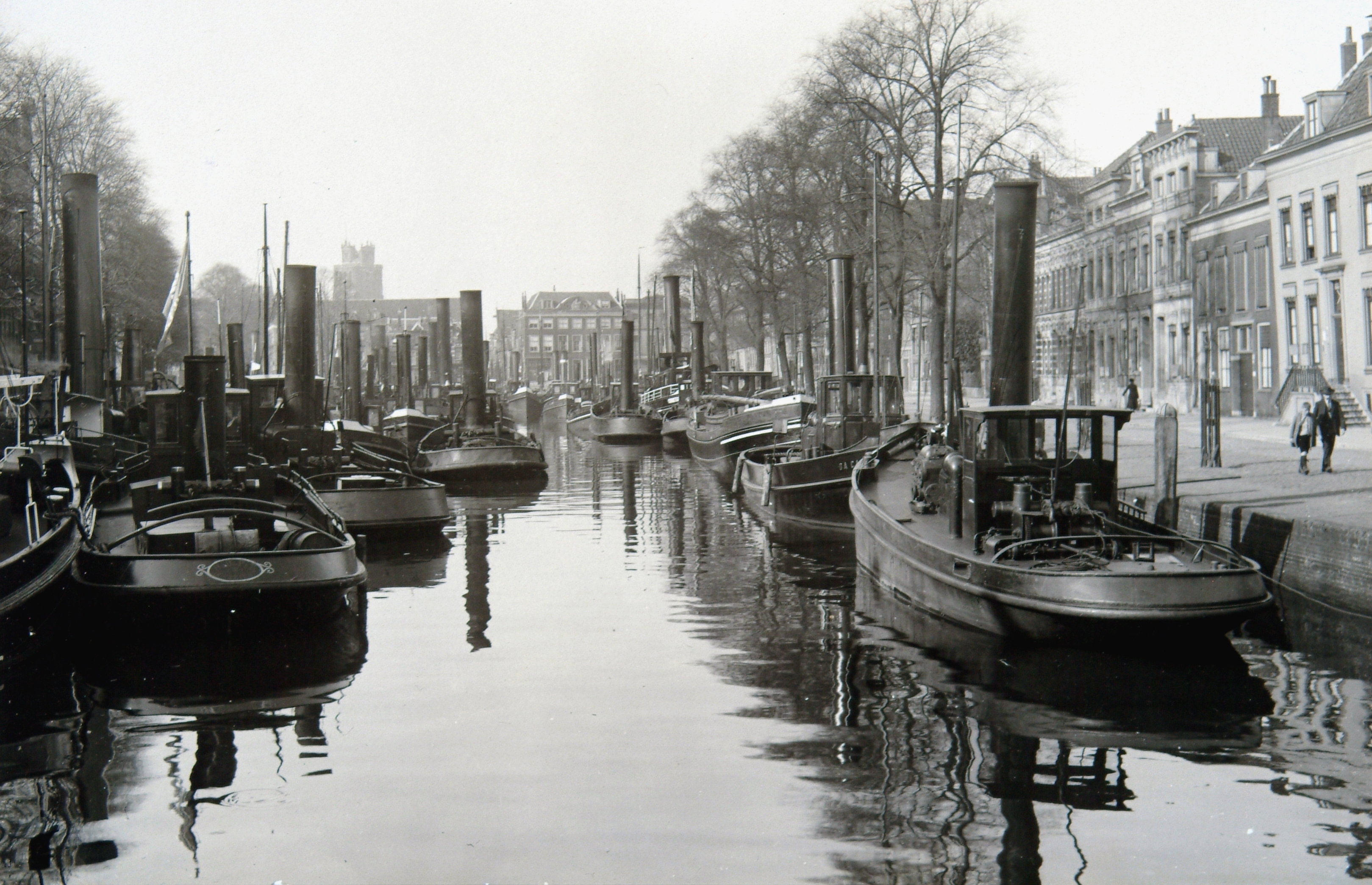 - De Wolwevershaven vanaf de Damiatebrug in de richting van het Vlak. De haven werd veel gebruikt als ligplaats voor sleepboten.