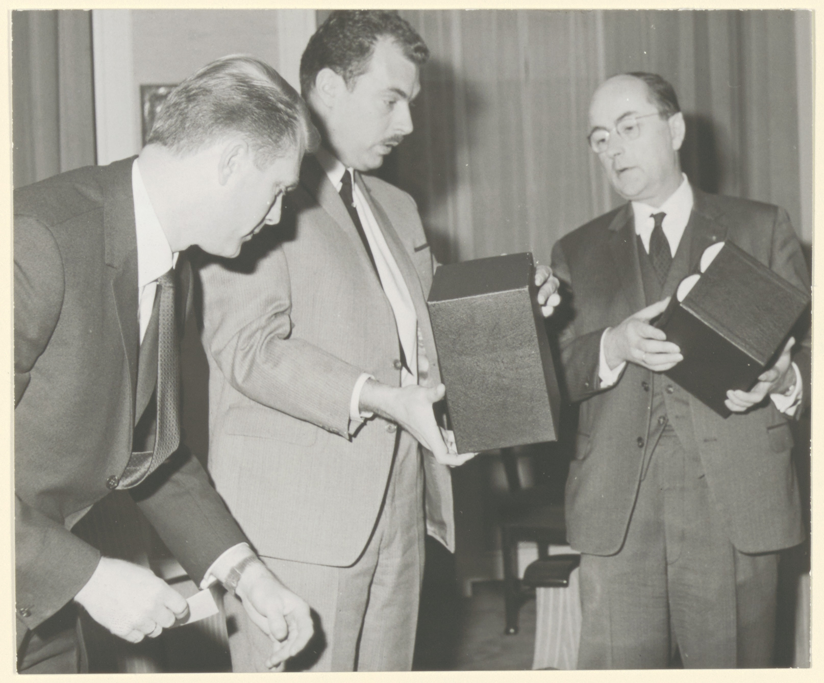 - Overhandiging van de facsimile uitgave van de Beschrijving van de stad Dordrecht door M. Balen, 1677 aan burgemeester J.J. van der Lee door de gebroeders Dijkstra.
