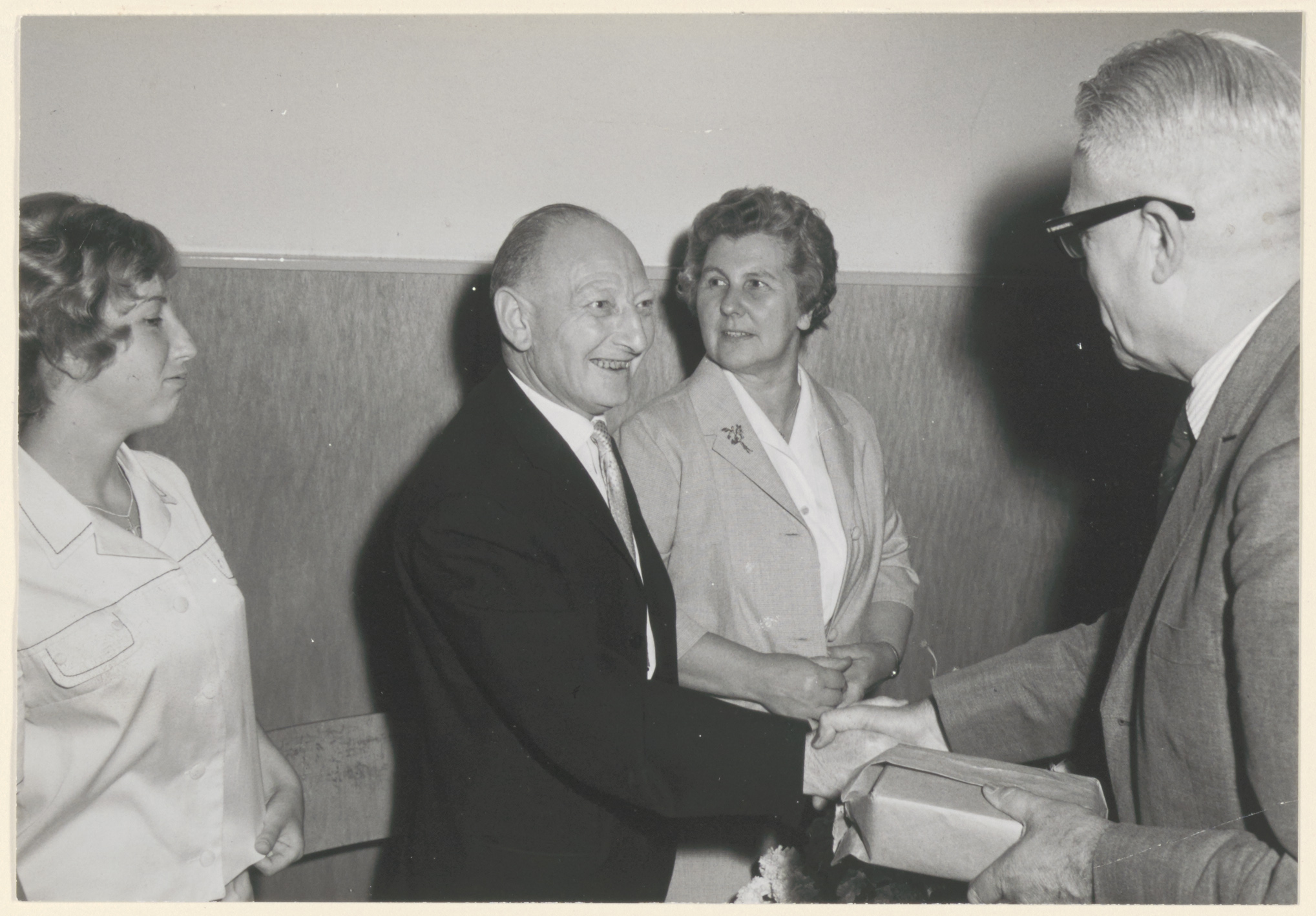 - Dhr. Muste, de vertrekkende voorzitter van Humanitas, wordt een cadeau aangeboden.