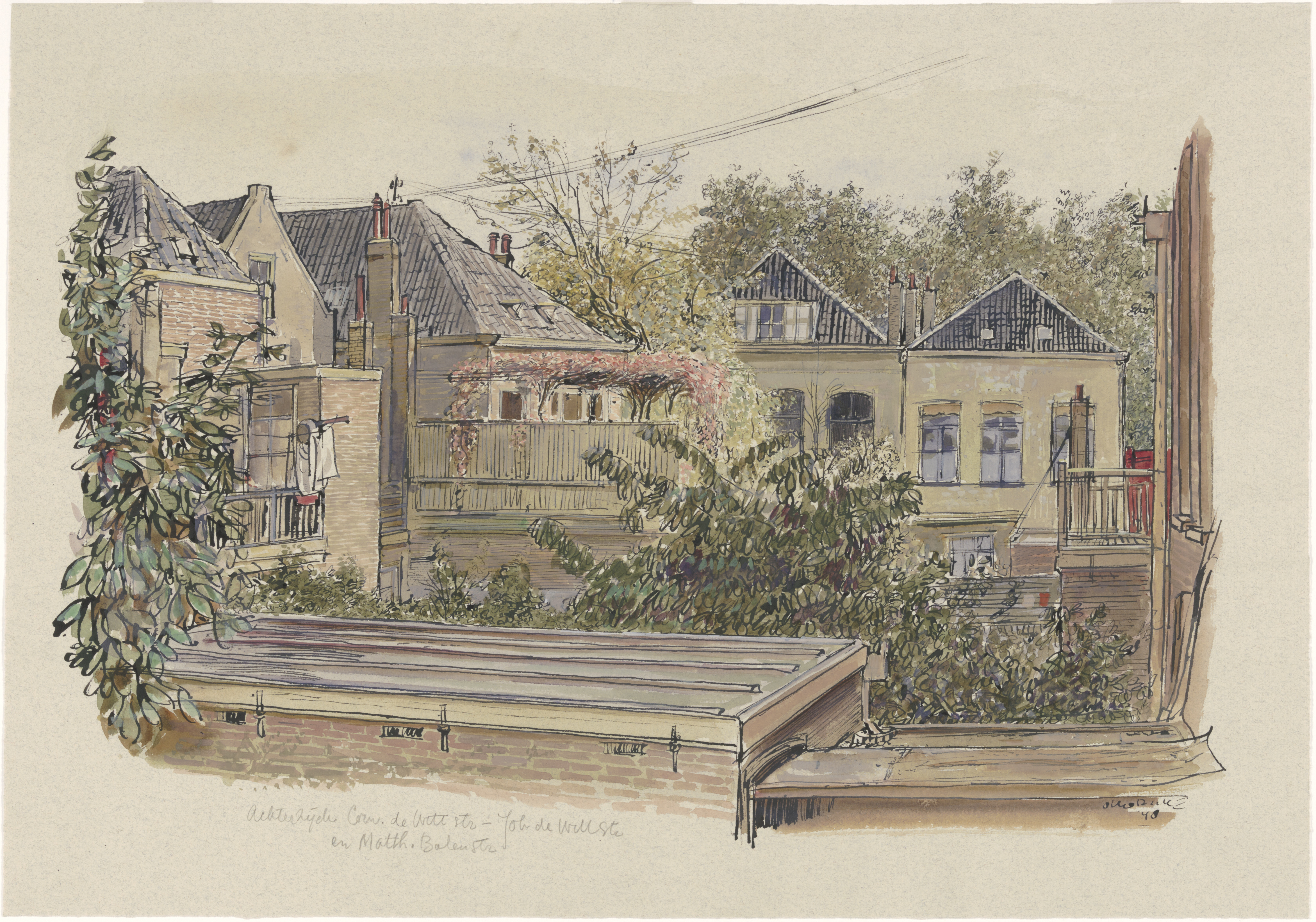 - Wittstraat, Johan de De achterzijde van de bebouwing aan de westzijde der Johan de Wittstraat tussen de Matthijs Balenstraat en de Cornelis de Wittstraat, gezien uit het westen, 1948.