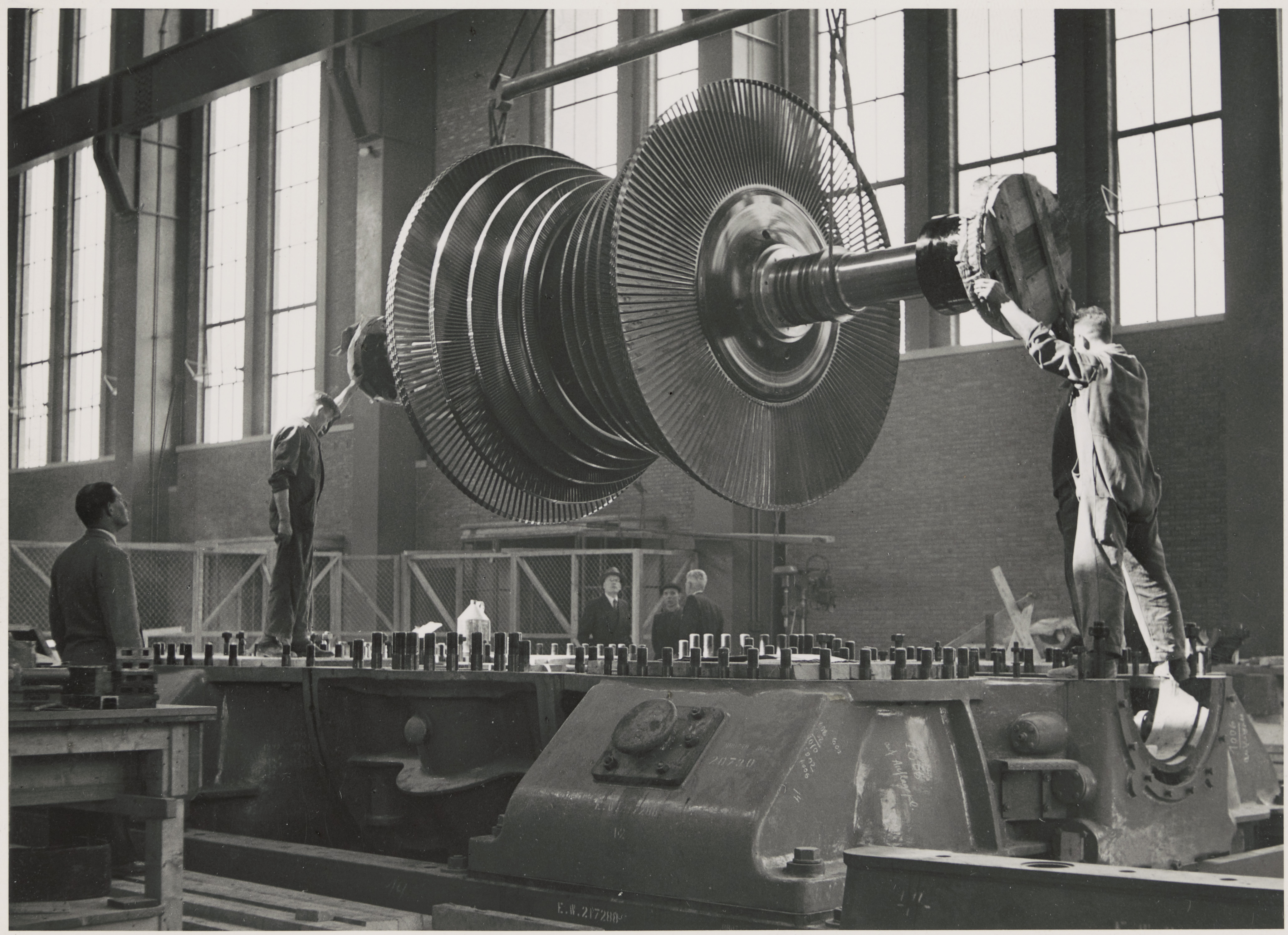 Plaatsing van een turbine in de Merwedecentrale op de Kerkeplaat.