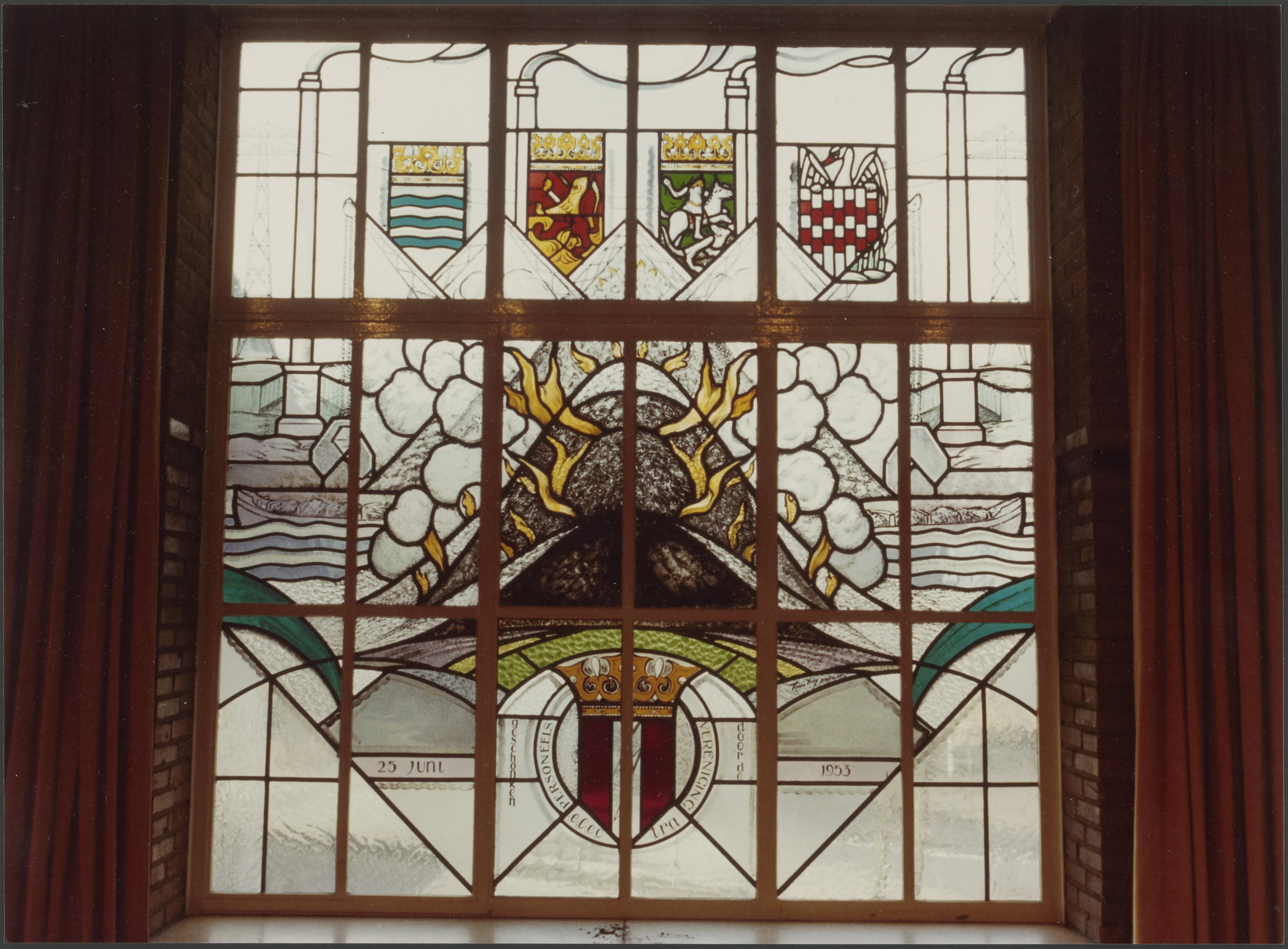 Glas-in-lood-raam in de bedrijfskantine gelegen op de eerste verdieping van het dienstengebouw. In 1982 werd dit gebouw gesloopt maar het raam werd verwijderd en opgeslagen.