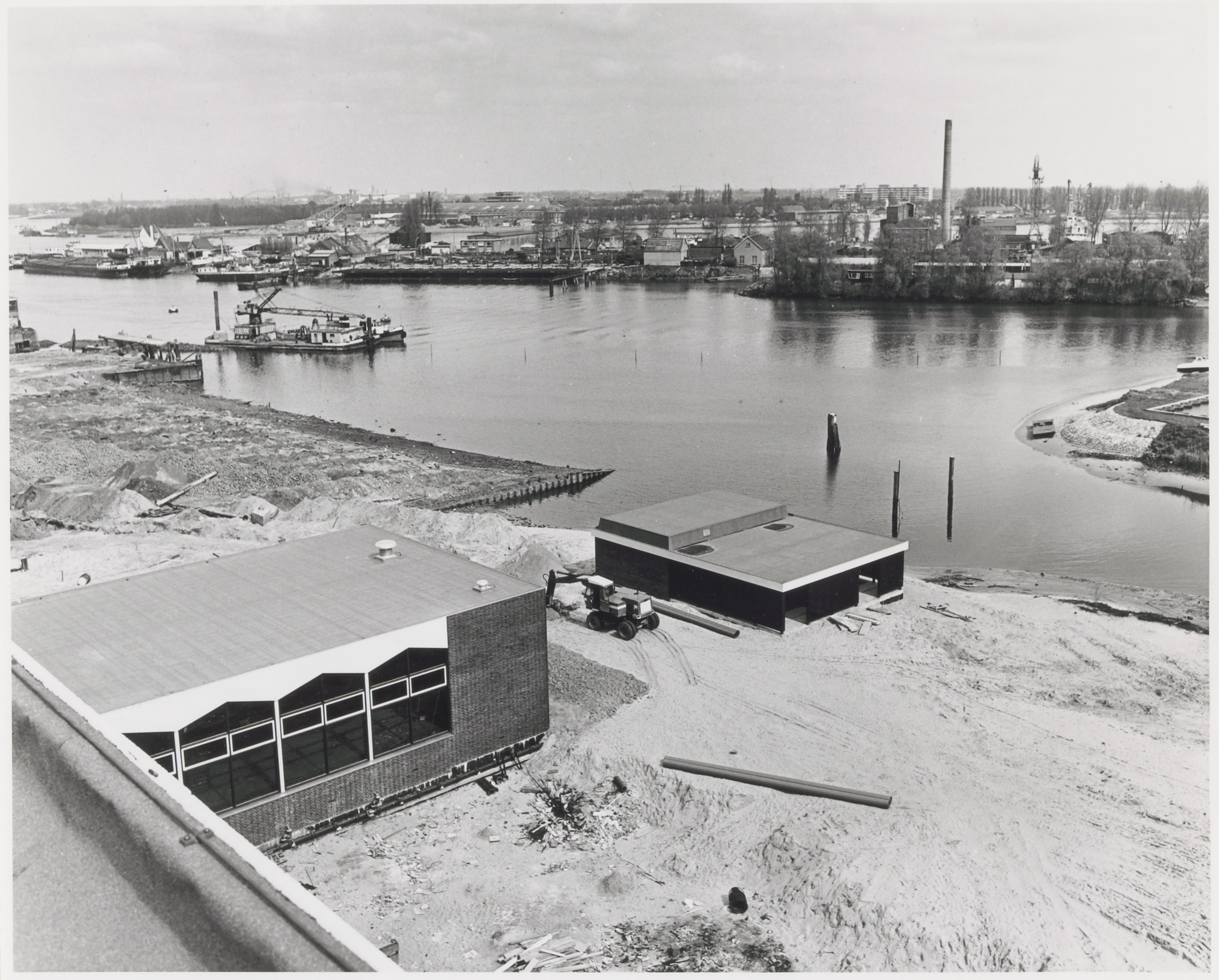 Zoals het Wantij, de Maasstraat met o.a. de zand,- en grindhandel van de fa Goedhart (kraanbaan) met daar weer achter de Beneden Merwede en Papendrecht. Het gebouwtje naat de graafmachine is een transformatorgebouw wat intussen verder is uitgebouwd.