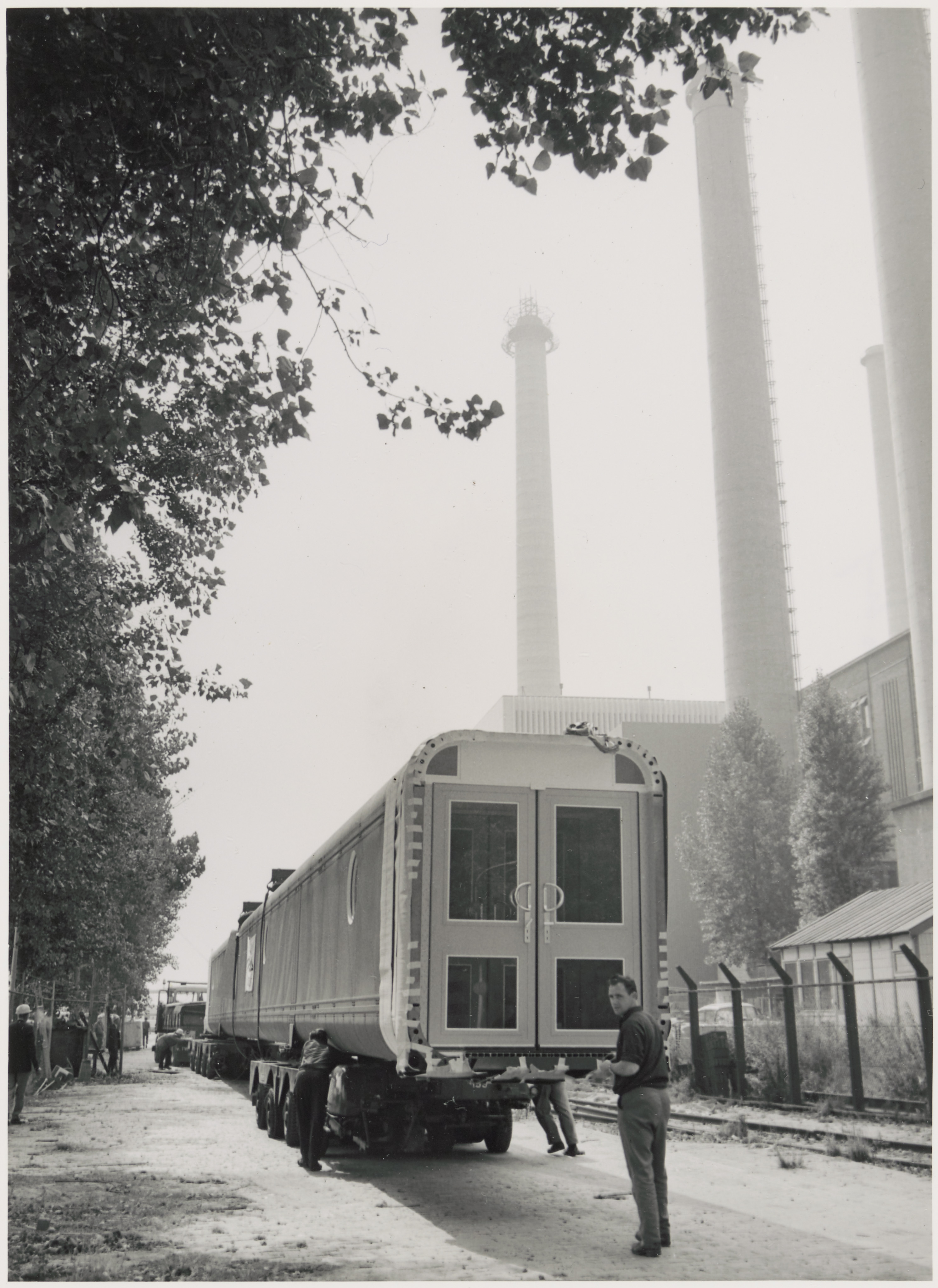 Aanvoer van de loopbrug tussen de nieuwe ketelhuizen van de Merwedecentrale op de …