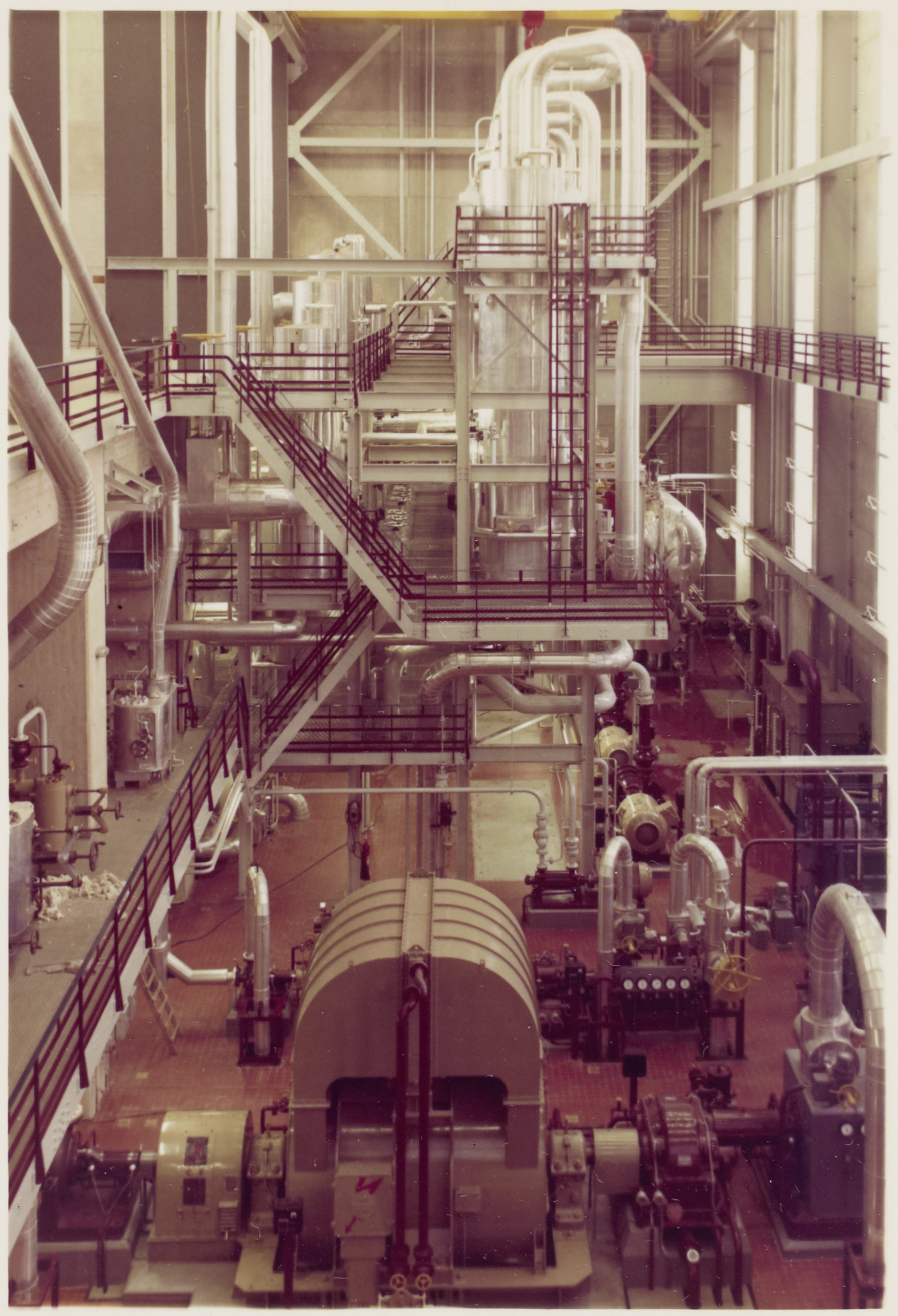 Voedingpompen op de begane grond gezien vanaf de stookvloer op 9.25 m hoogte. De eenheid had een vermogen van 150 megawatt.