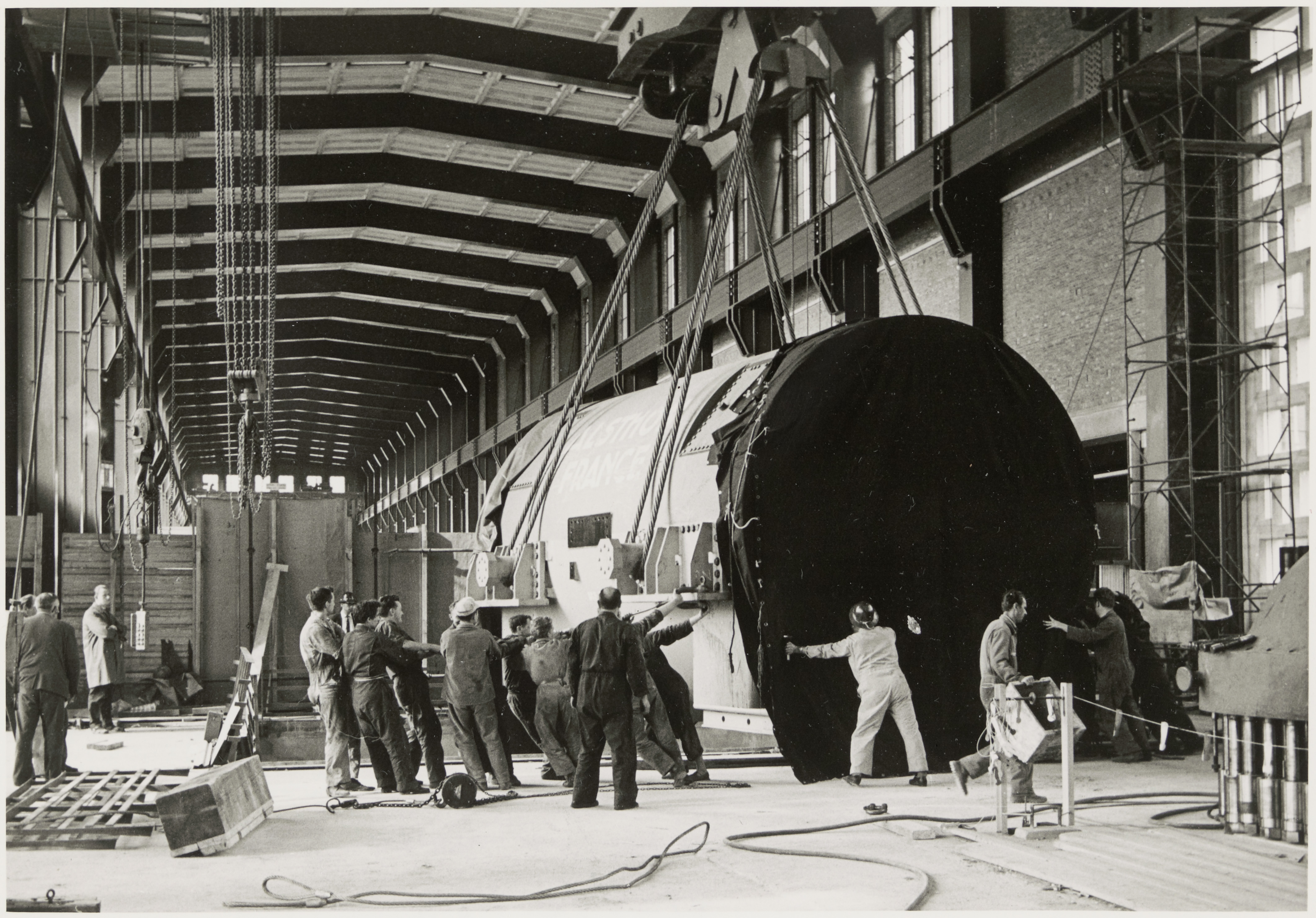 Inhijsen van de stator van de 150 megawatt turbo-generator. Op de achtergrond het deel van de prachtige machinezaal van CM 1 en 2 met vier eenheden van elk 50 megawatt.